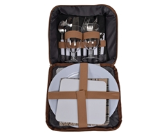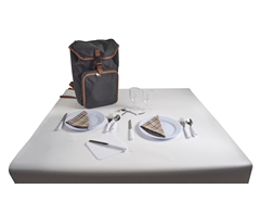 - The backpack includes two place settings with plates, cutlery, glasses, and napkins.