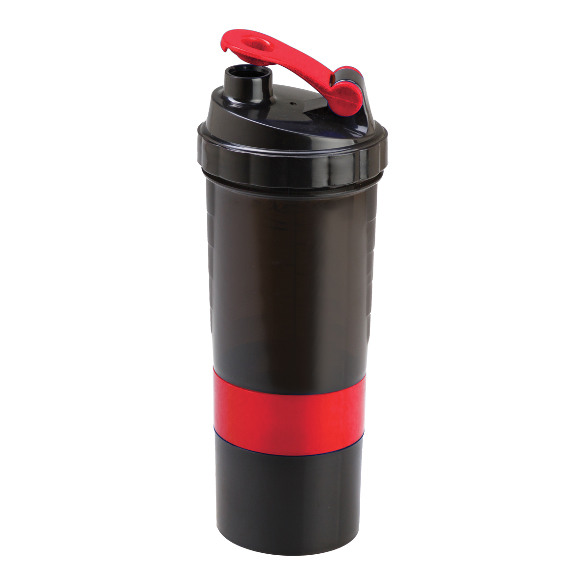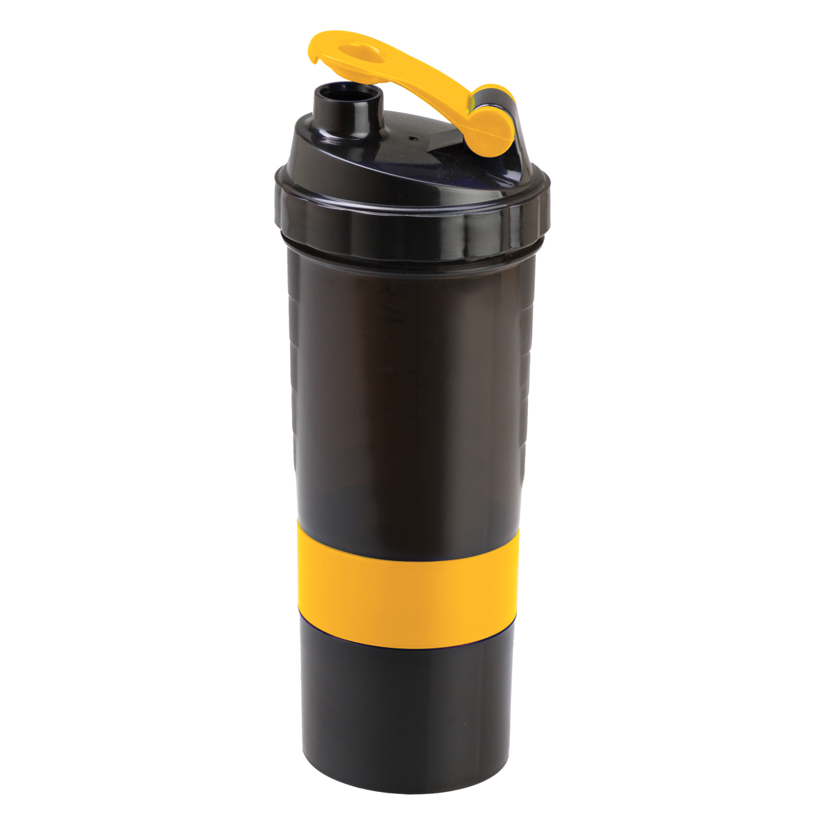 This 500ml 3-in-1 shaker helps users mix drinks and store supplements or pills easily. It is made from strong, BPA-free plastic and includes a stainless steel blender. Two extra screw-top compartments provide added storage. This item keeps your brand visible.