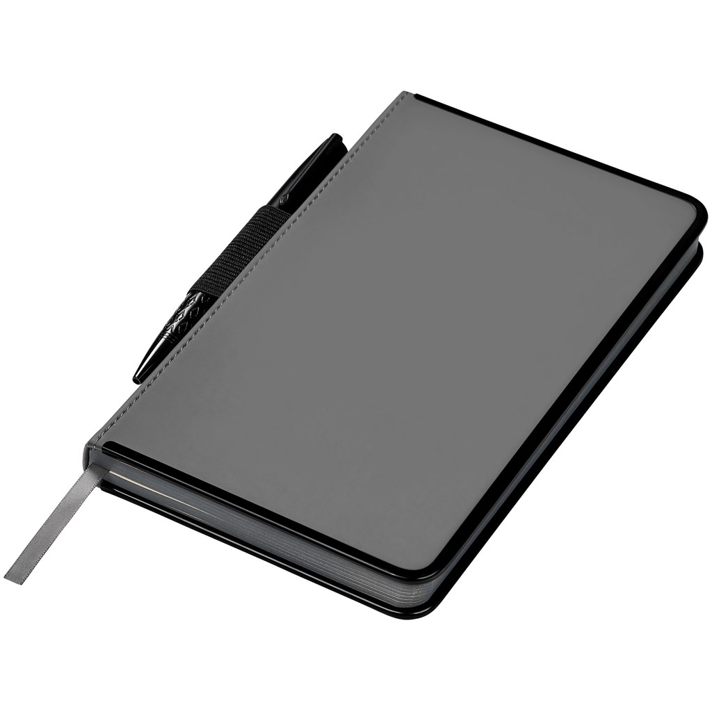 - The notebook features a soft matte finish, a contrasting black metal frame, an elasticated pen loop, and painted edges.