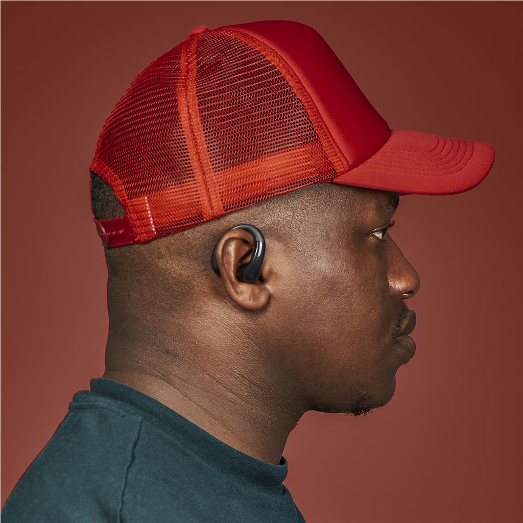 - The ear hook design sits securely on the ear without entering the ear canal, allowing awareness of ambient sounds for safety during outdoor activities.