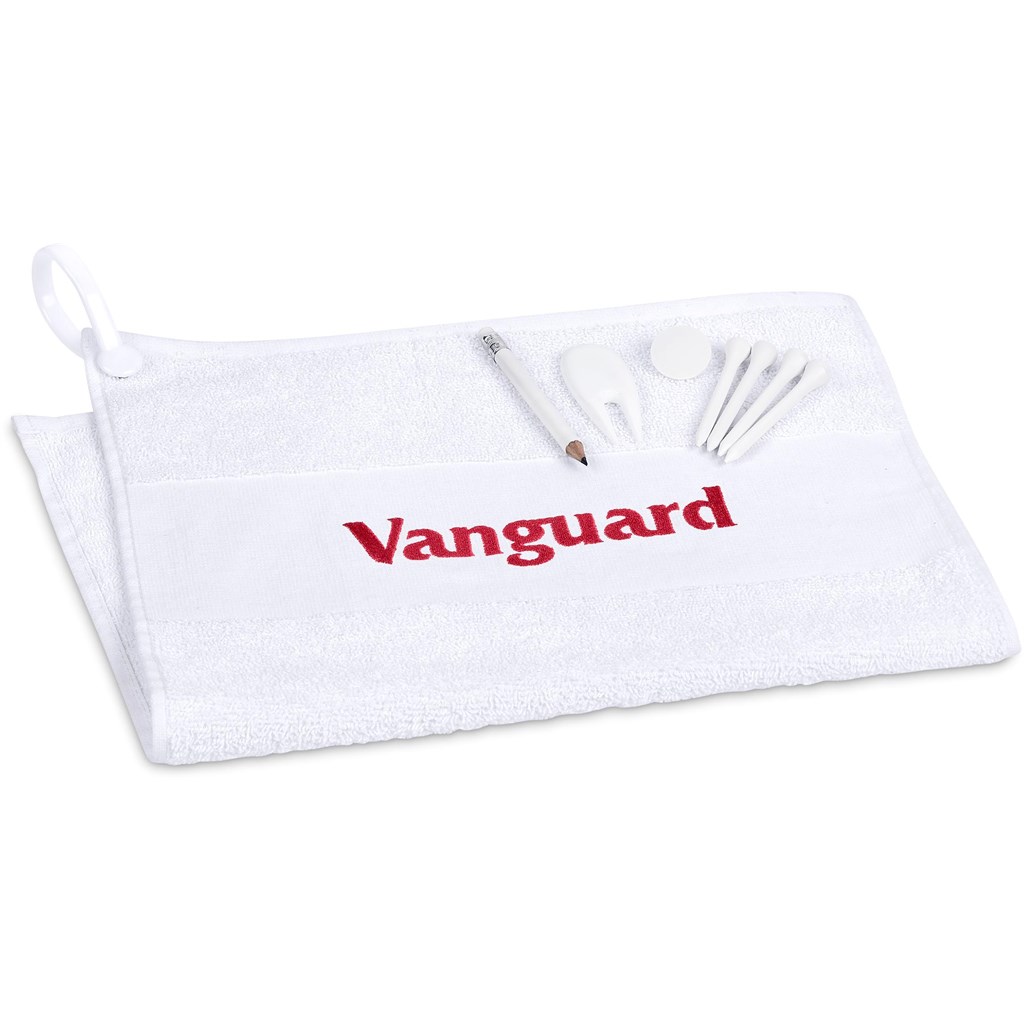 This Altitude Monte Rei Golf Set is ideal for golf day promotions. It includes a PVC pouch, a 100% cotton golf towel with a carabiner, a pencil, divot tool, ball marker, and four tees. A practical way to display your brand.