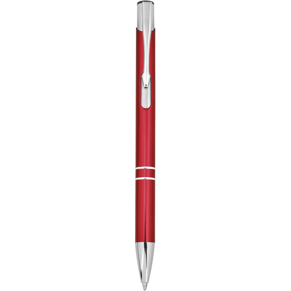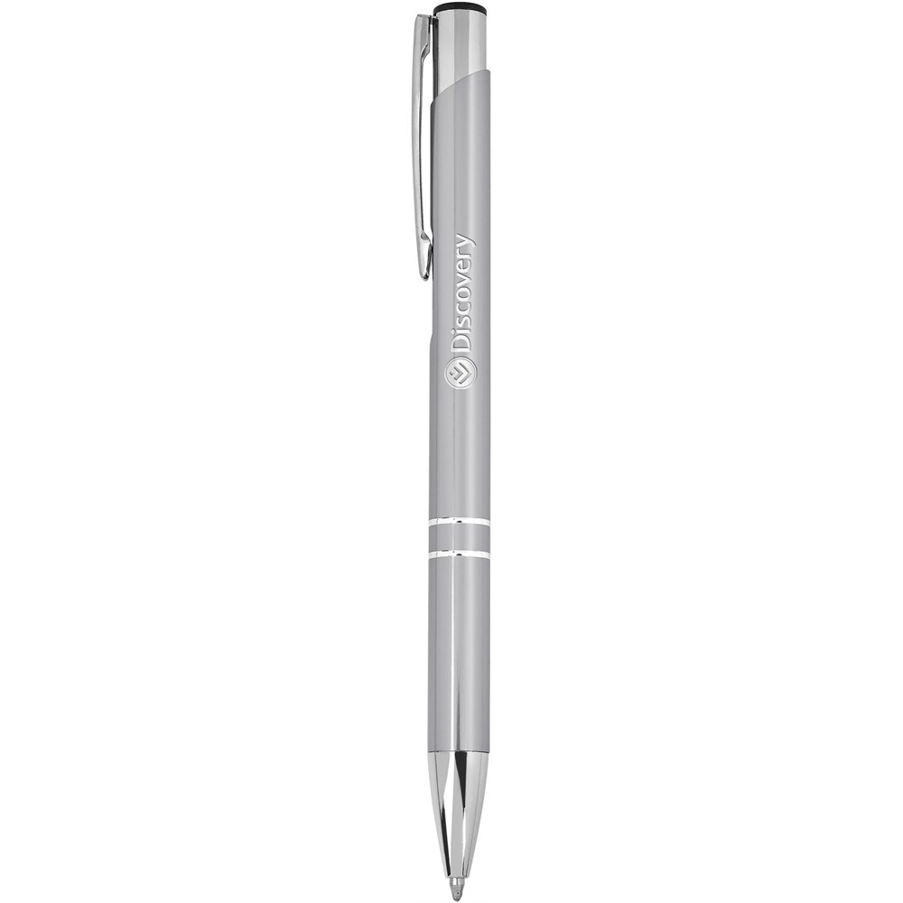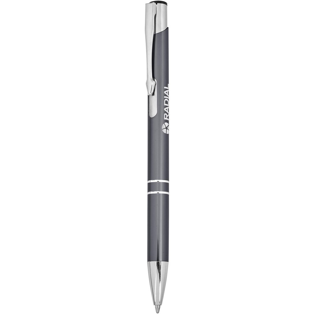 - This retractable ball pen features a shiny anodised aluminium barrel with shiny chrome accents.