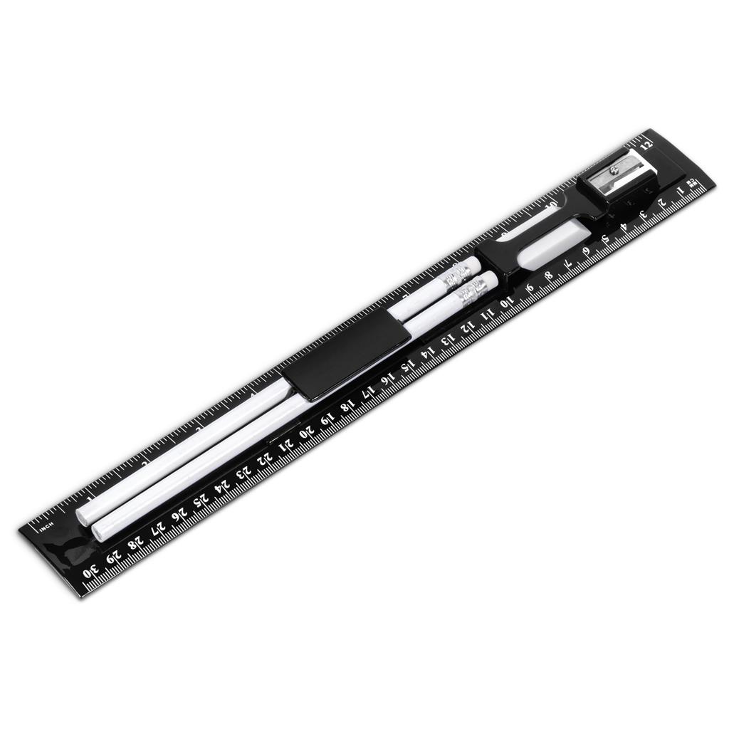 - The set includes a 30cm plastic ruler, two wooden pencils, an eraser, and a plastic sharpener.