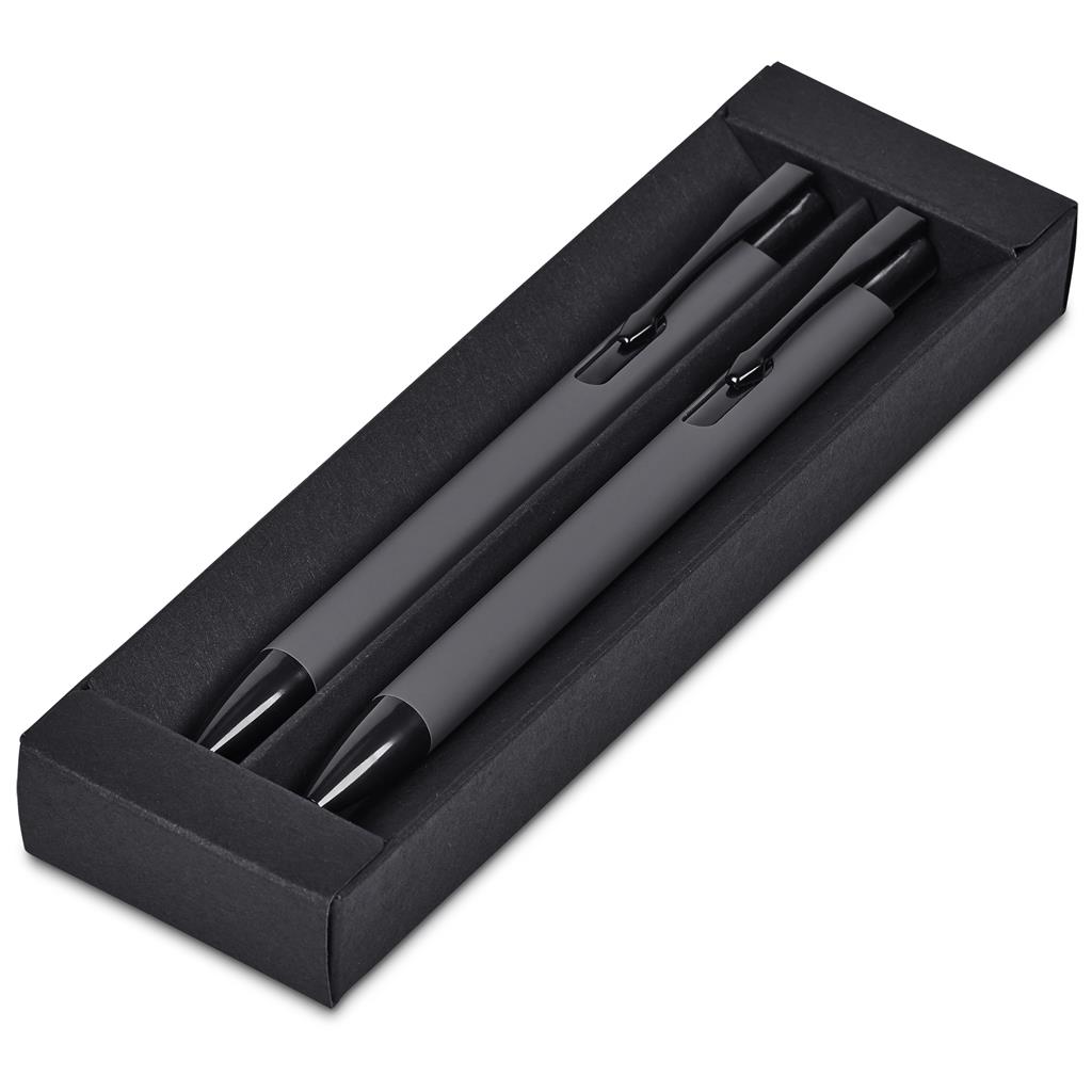 This Altitude Zeta pen and pencil set is ideal for promotional campaigns. It features comfortable matte rubberised aluminium barrels. The ball pen uses black German ink, writing for 1,500 metres, and the mechanical pencil includes two 0.7mm leads. A useful item for clients and staff.