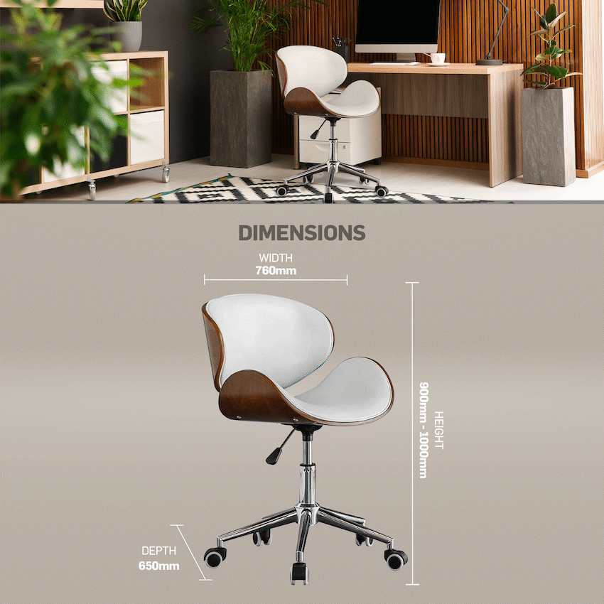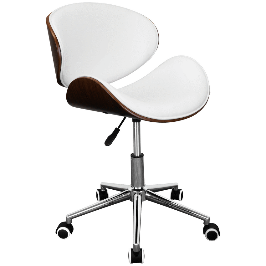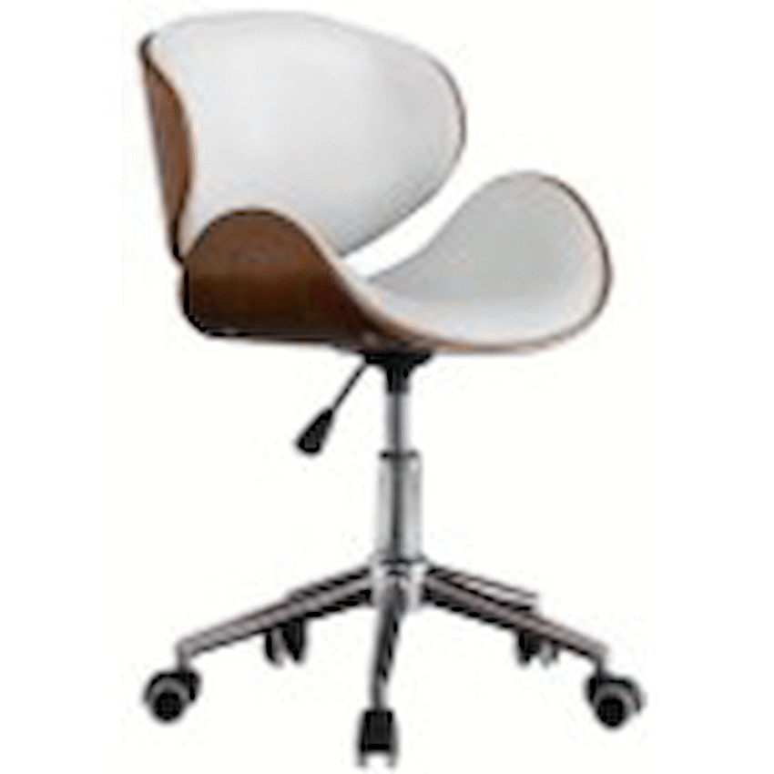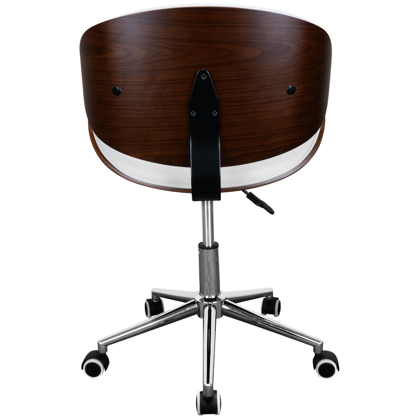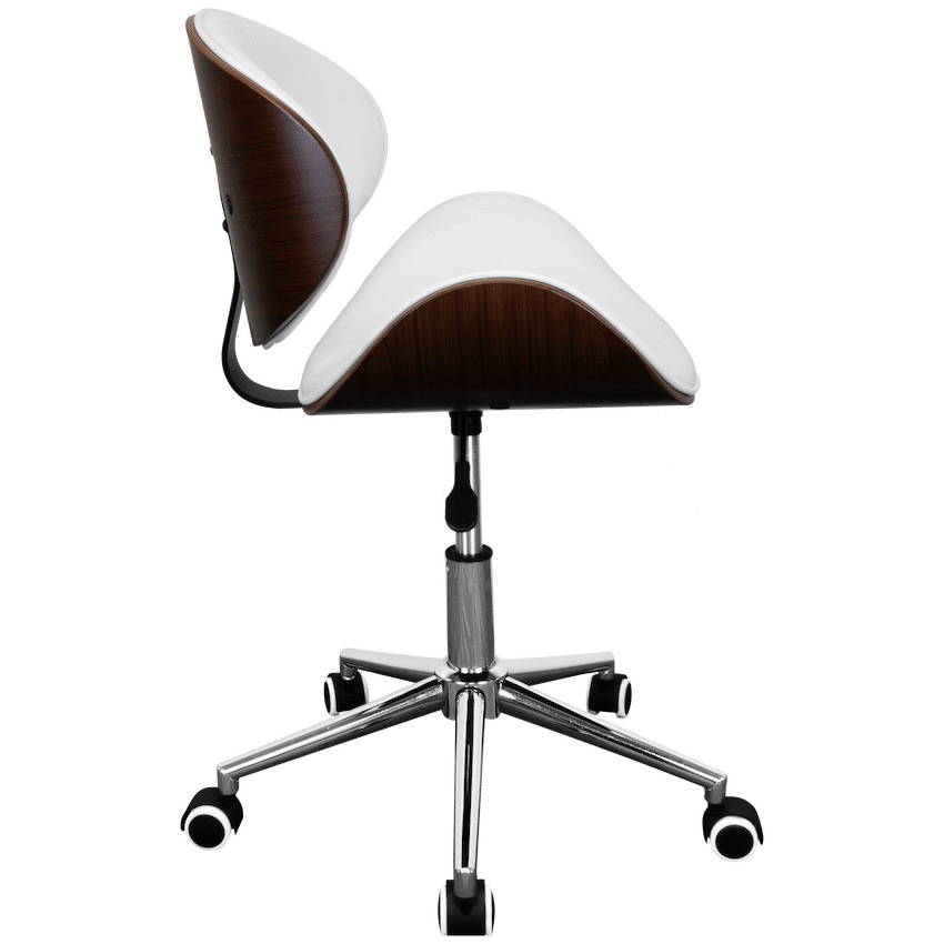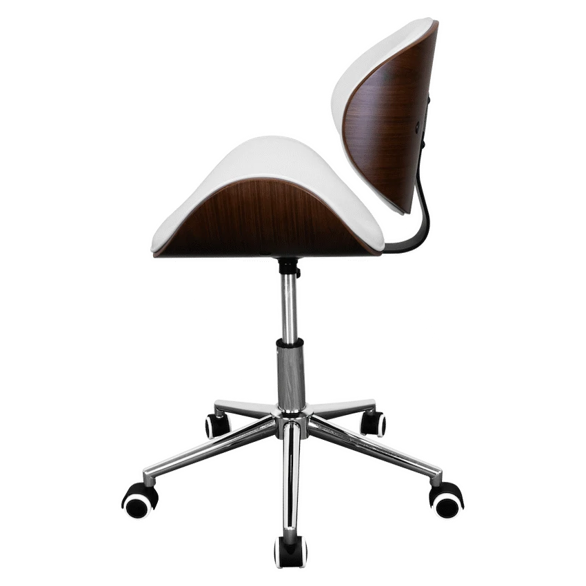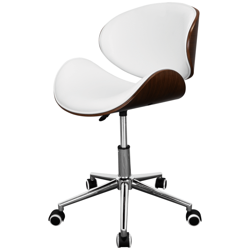 - This office chair features clean white PU upholstery, complemented by dark wood accents and a chrome base.