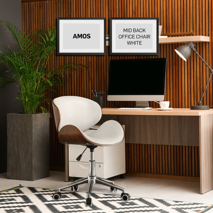 This Amos Mid Back Office Chair offers comfortable, practical seating for daily office use. It features clean white PU upholstery with dark wood accents and a chrome base. This chair suits any corporate setting.