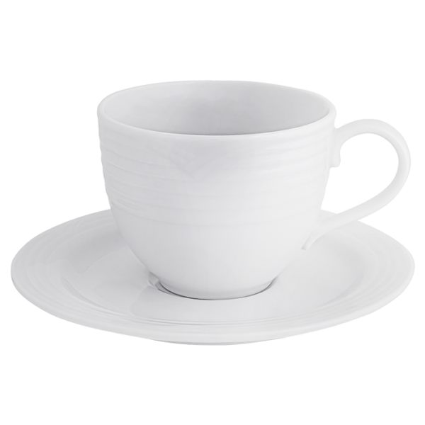 - Contemporary design in white with a subtle circular embossed rim on a white fine porcelain body
