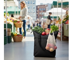 This black shopper bag provides a good surface for displaying corporate logos and messages during general promotional campaigns.
