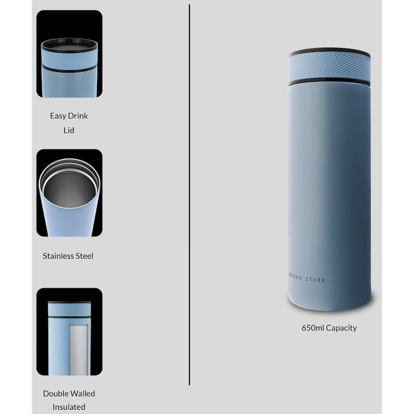 This Boden Stark 650ml double-walled flask keeps drinks hot or cold for longer. Made from stainless steel, it features vacuum insulation and a matte blue finish. This practical item is suitable for daily use, reflecting Boden Stark quality.