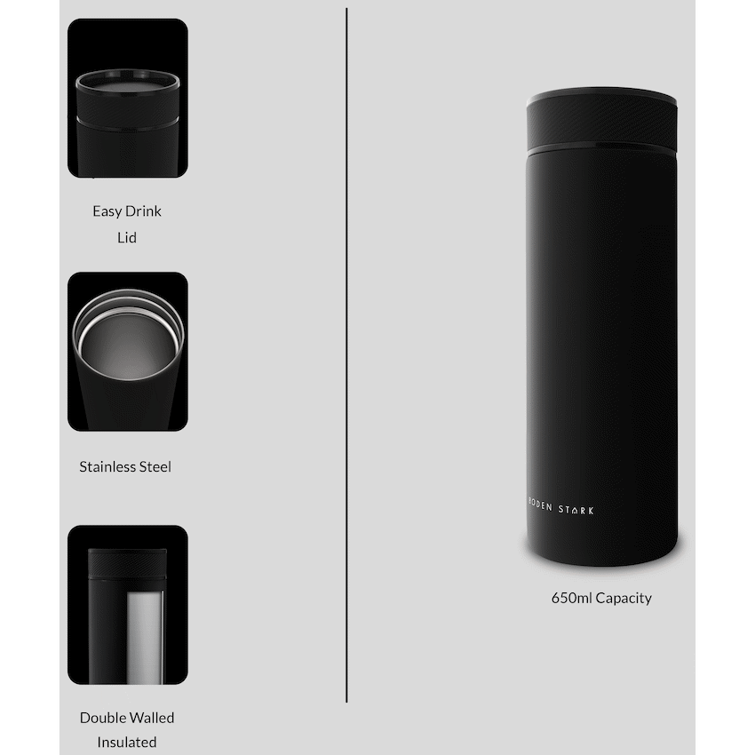 Keep drinks hot or cold for longer with the Boden Stark 650ml Travel Flask. This flask holds 650ml and is made from double-wall vacuum insulated stainless steel. Its matte black finish makes it a practical choice for everyday use from Boden Stark.