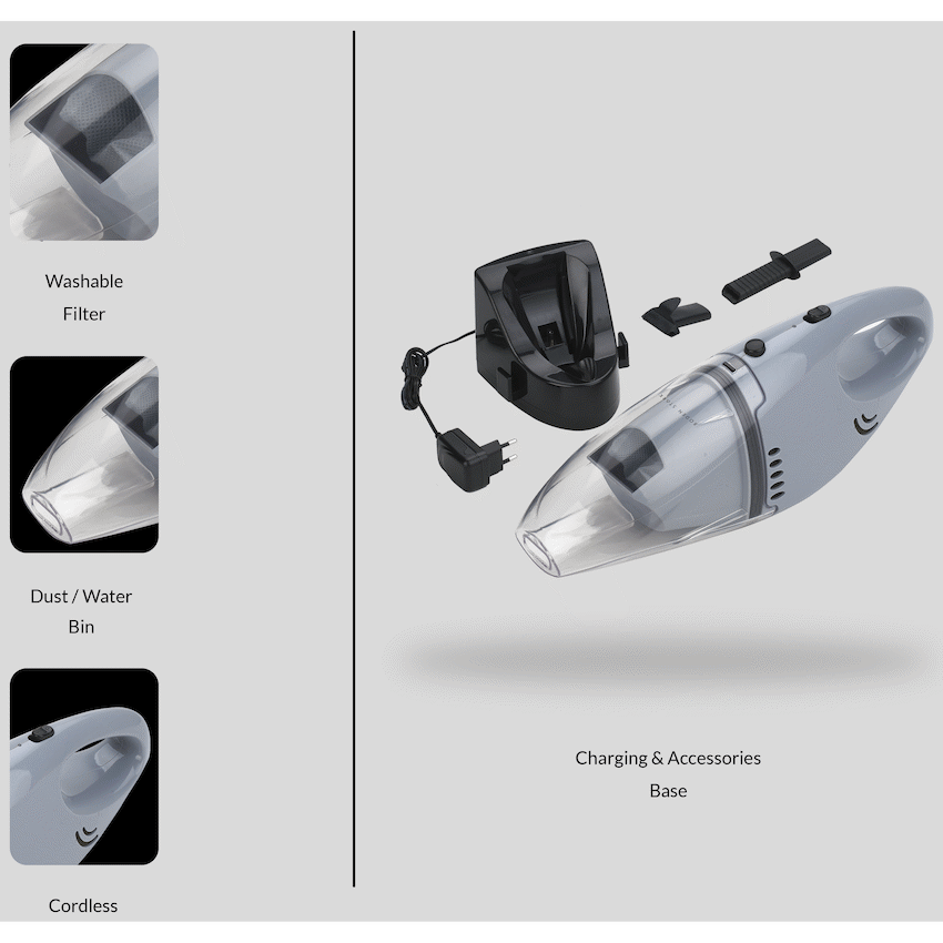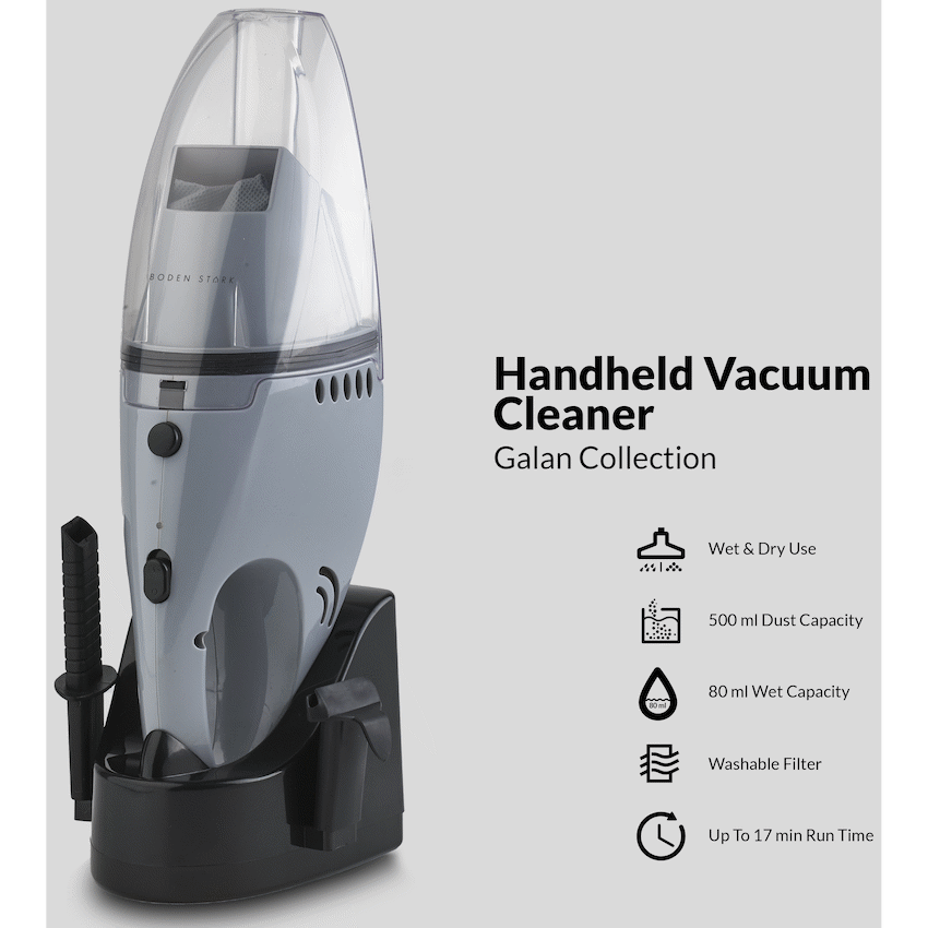 This Boden Stark handheld vacuum cleaner provides practical, portable cleaning for wet and dry messes. It uses a 45W motor and a rechargeable battery for up to 17 minutes of operation, making it suitable for quick clean-ups and promotional use.