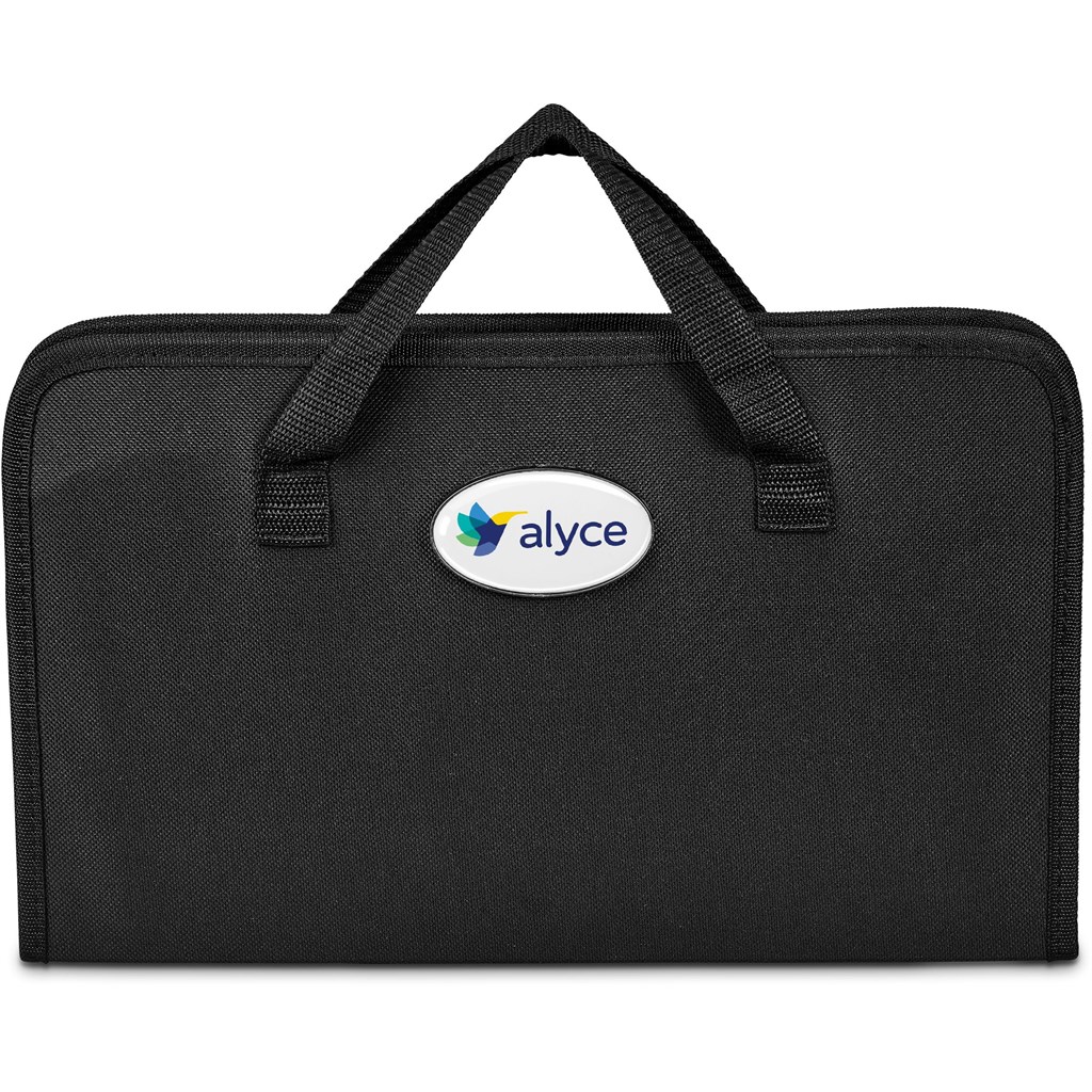 This Brenton braai and carving set is suitable for branding, with a recessed badge area on the carry bag for your logo.