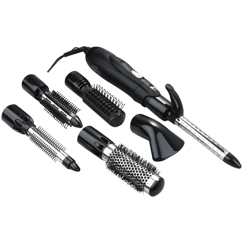 • This Carmen Multi Style Hot Air Brush includes multiple attachments such as a short brush, curling brushes, concentrator, thermal round brush, and a curling brush with retractable bristles, allowing for various hair styles.