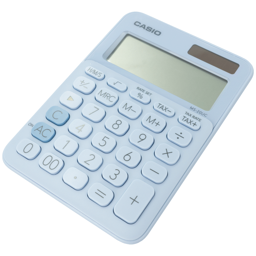 The Casio MS-20UC light blue desktop calculator simplifies daily calculations. It has a clear 12-digit extra-large display and useful functions like tax and time calculations. Two-way power ensures reliable use for business tasks.