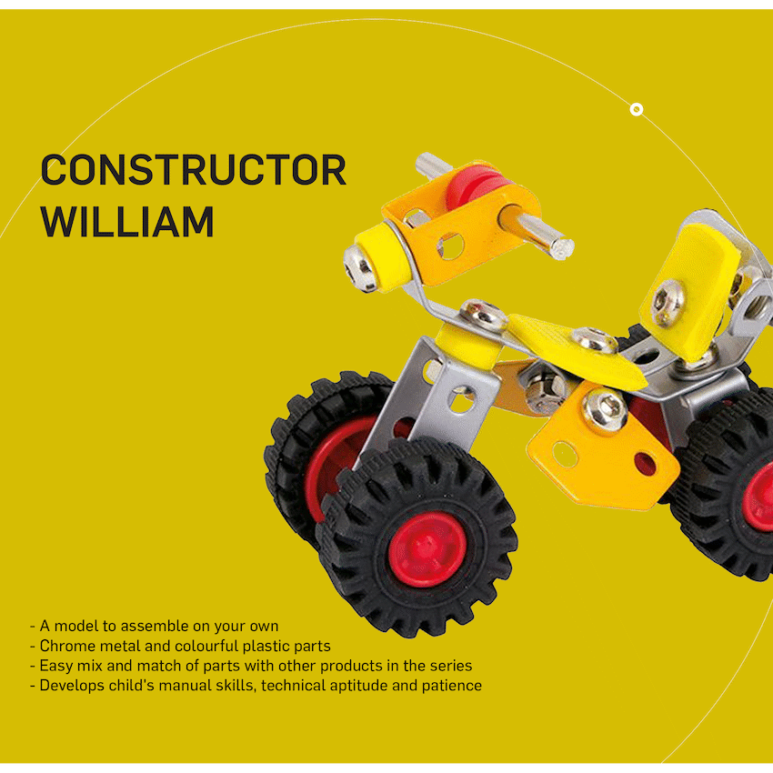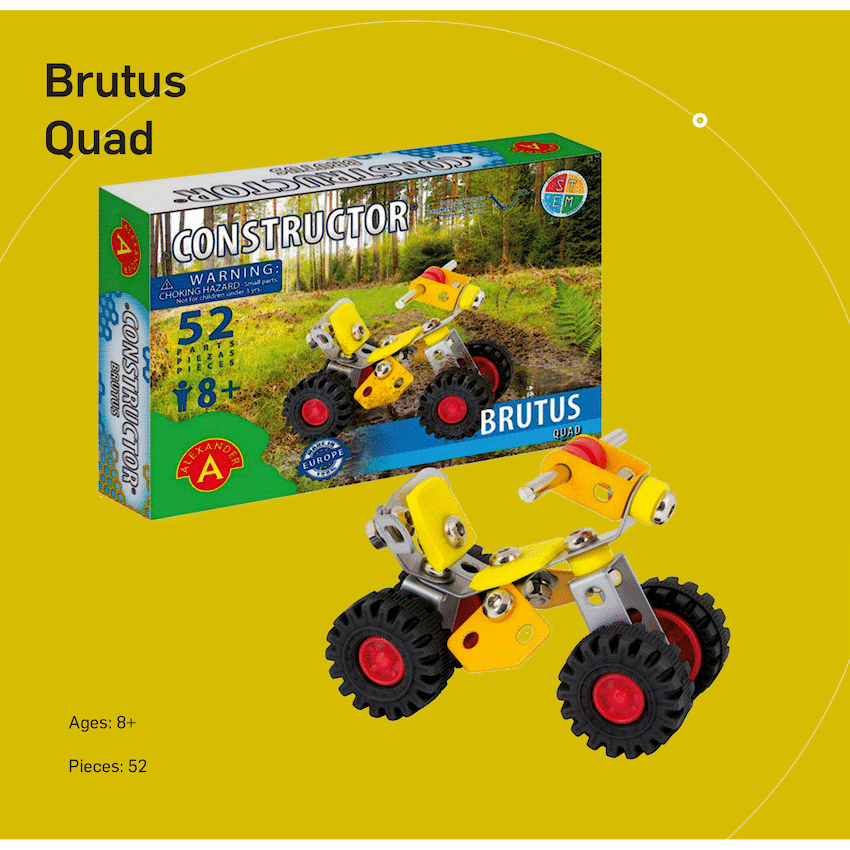 The Constructor – Brutus (Quad) model kit helps develop manual skills and spatial intelligence. This assembly kit is for ages 8 and up, featuring 52 parts made from chrome metal and colourful plastic. It makes a memorable promotional gift.