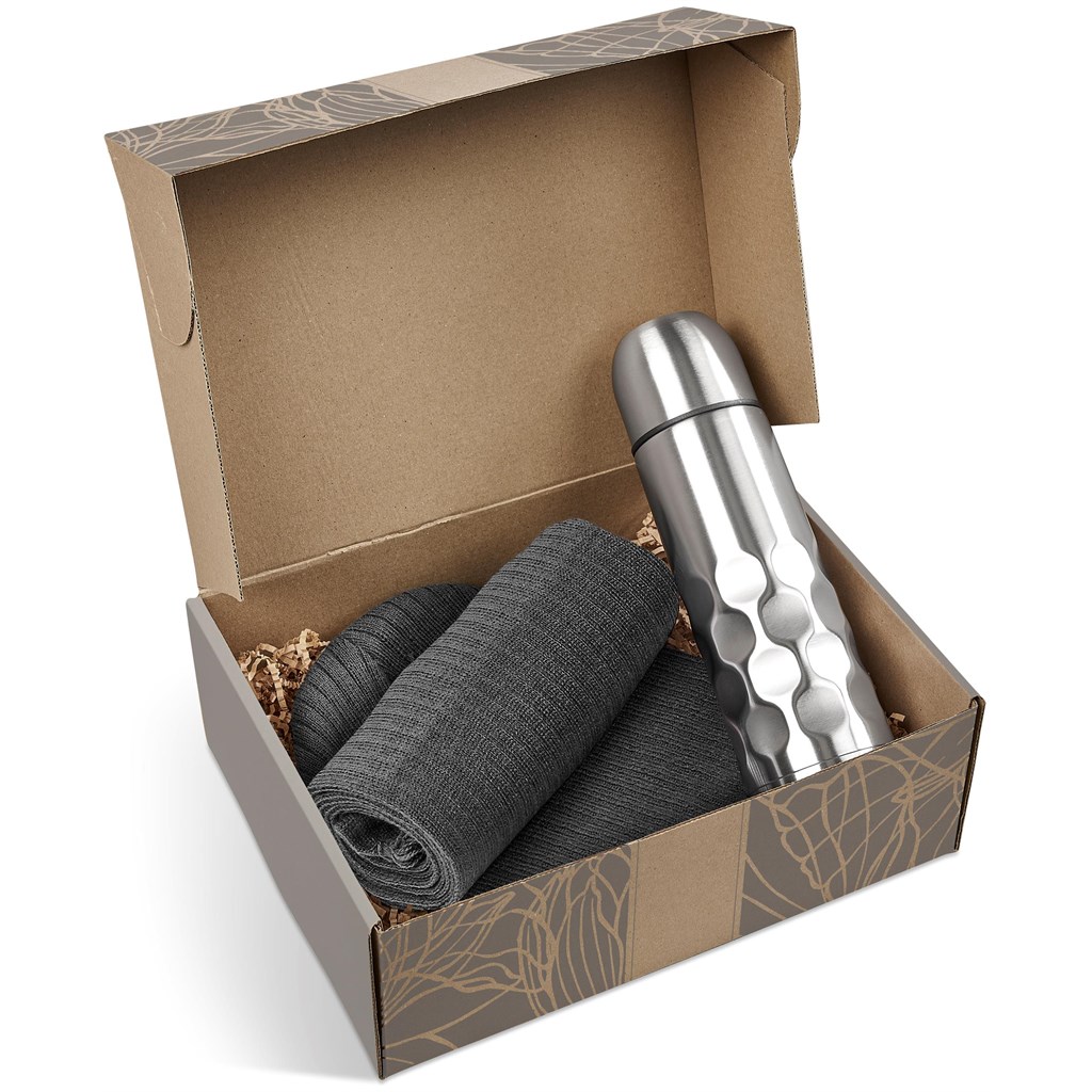 The Dayton Winter Gift Set helps promote your brand and show appreciation. It contains a warm acrylic cable knit beanie, a matching scarf, and a stainless steel flask for hot beverages. This practical set is ideal for colder seasons.