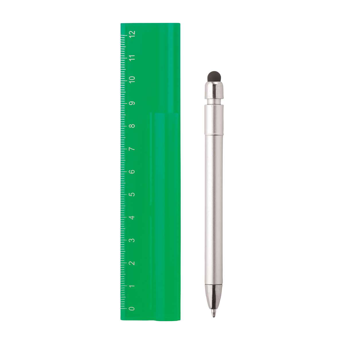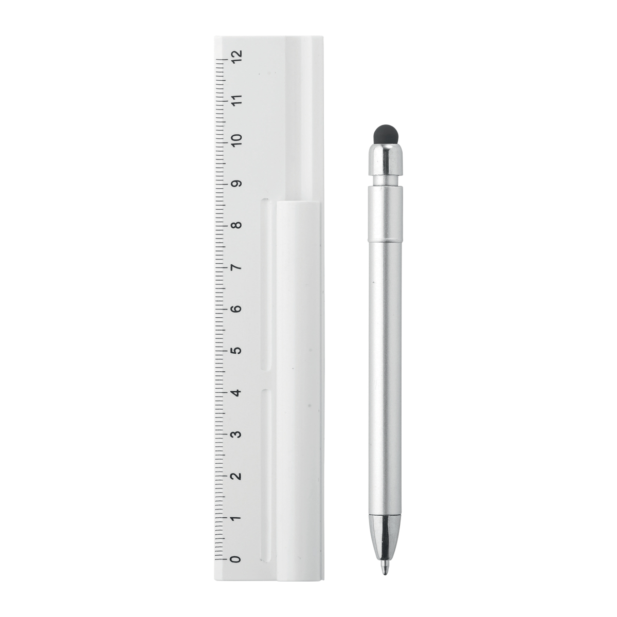The DUO Stationery set offers practical items for daily use. It includes a durable plastic 12cm ruler and a stylus pen with black ink for writing and touchscreens. This set works well for promotional branding efforts.