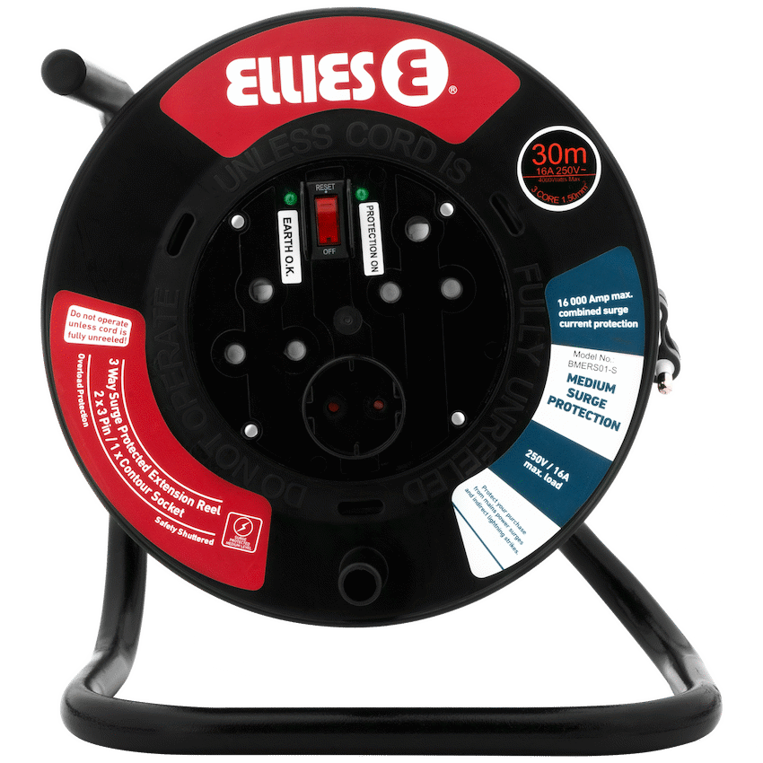 This Ellies Heavy Duty Extension Reel offers dependable power for workshops and large outdoor areas. It has a 30-metre cable and three sockets, with surge protection to guard connected tools. This Ellies product provides a practical electrical supply.