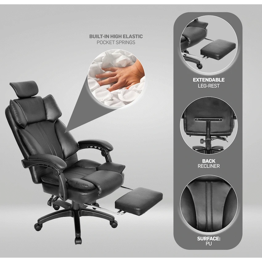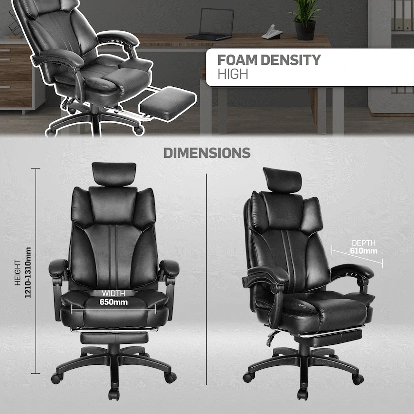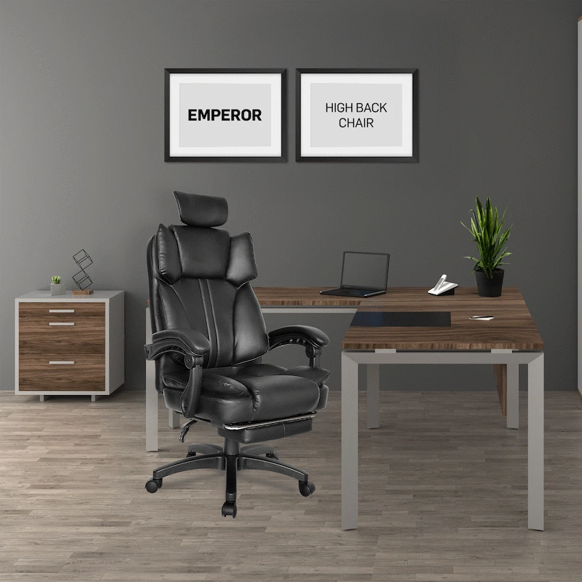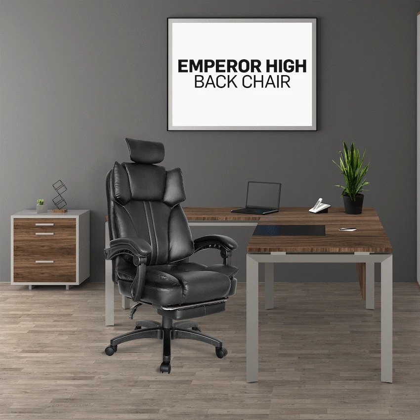 This Everfurn Emperor High Back Chair offers comfortable office seating. It features durable PU material and an extendable leg rest for extra comfort. This black high-back chair is a practical Everfurn item for any workspace.
