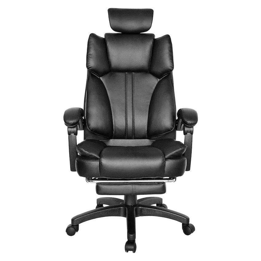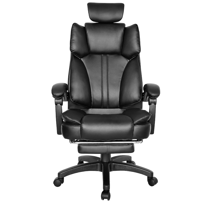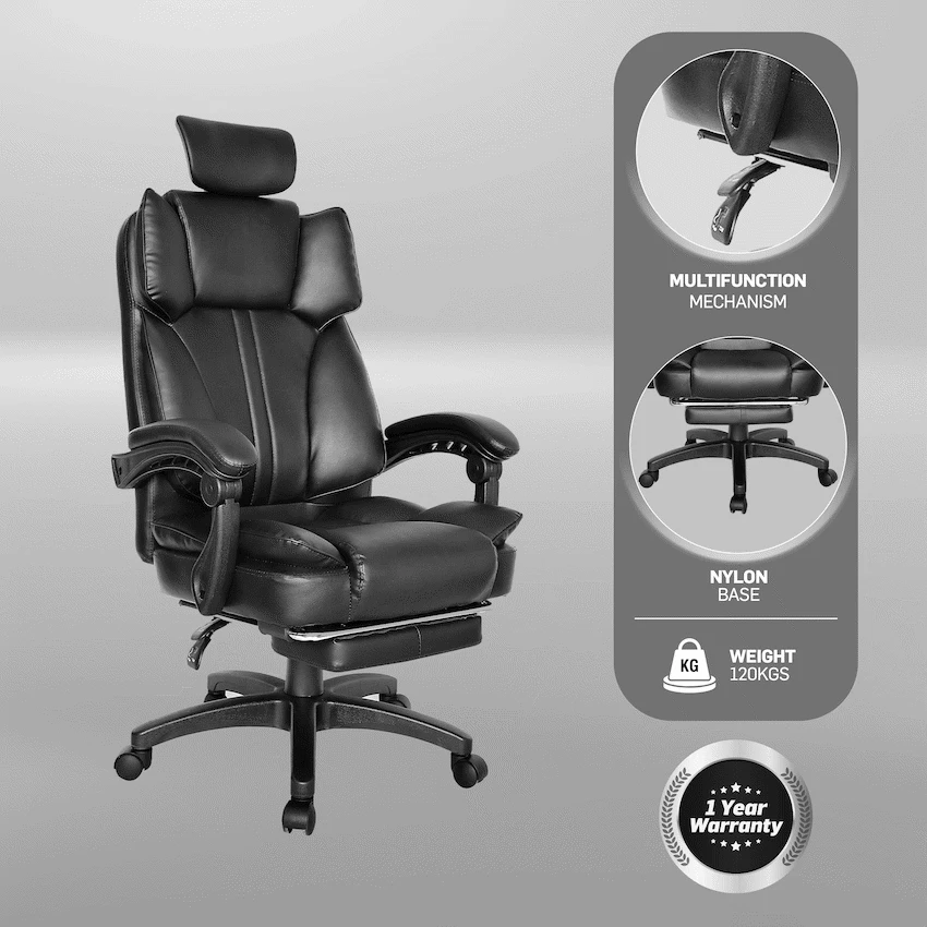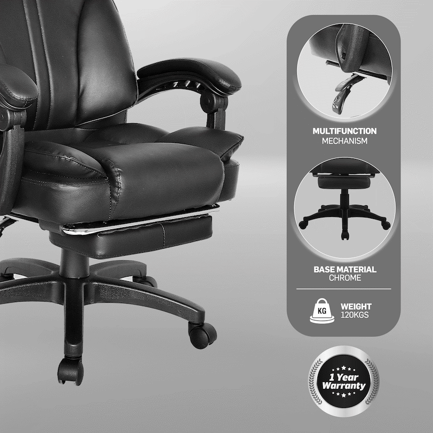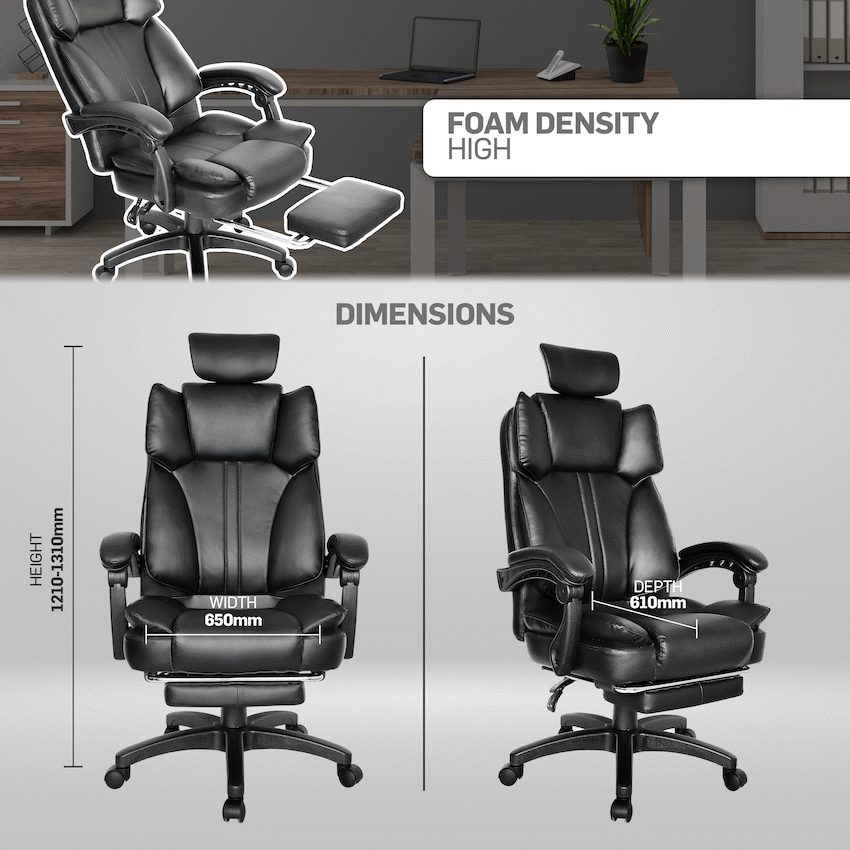 This Everfurn Emperor High Back Chair offers comfortable office seating. It features durable PU material and an extendable leg rest for extra comfort. This black high-back chair is a practical Everfurn item for any workspace.