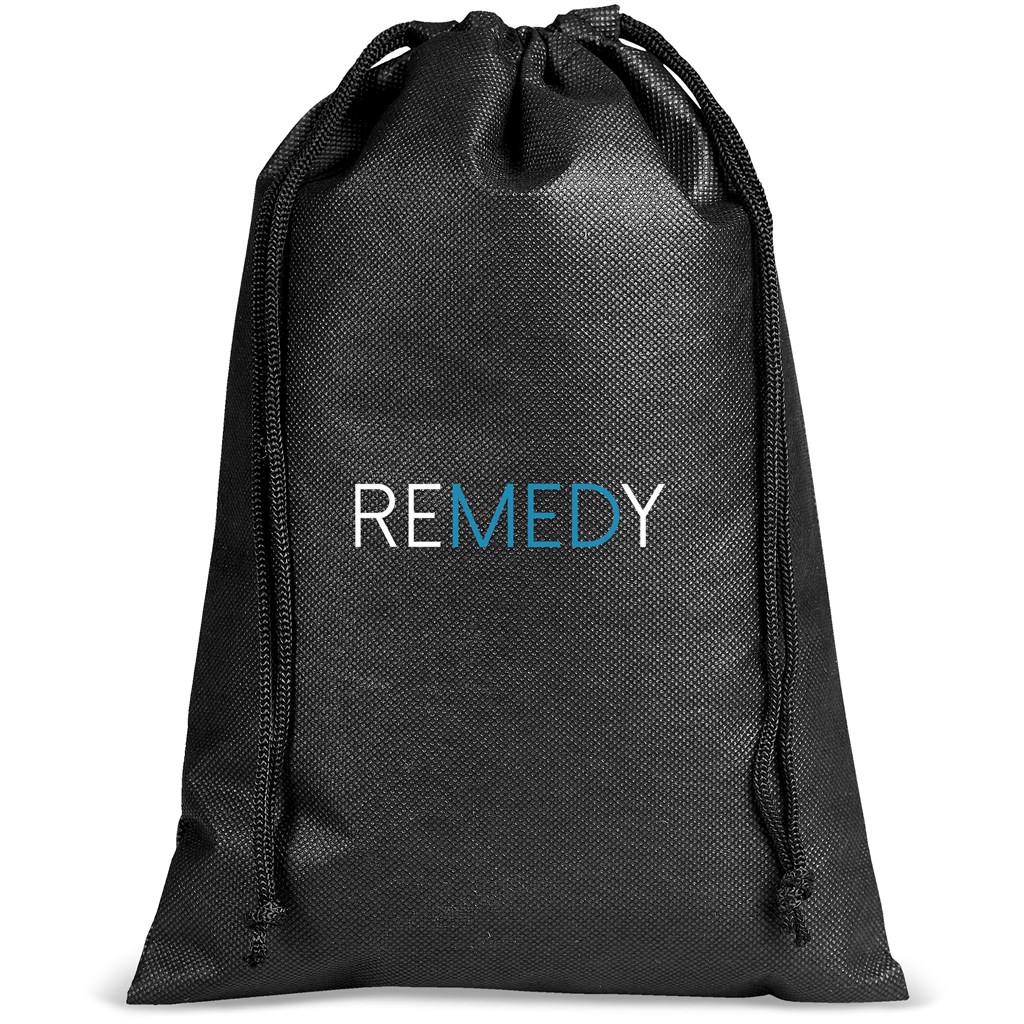 - Both items are presented in a Quando non-woven drawstring pouch, made from 80gsm non-woven polypropylene material with a black drawstring closure.