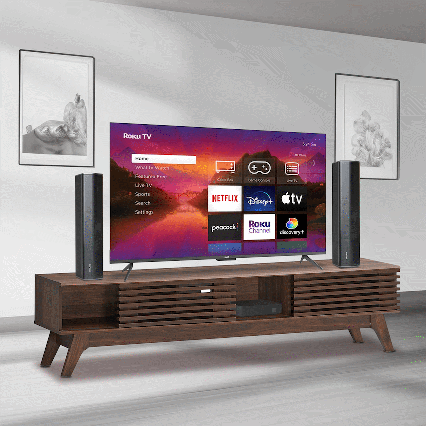 - Built-in storage compartments help keep media accessories neat and out of sight.