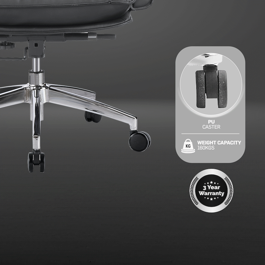 - Includes a chrome base with racer casters for stability and smooth movement, supporting a maximum weight capacity of 160kg.