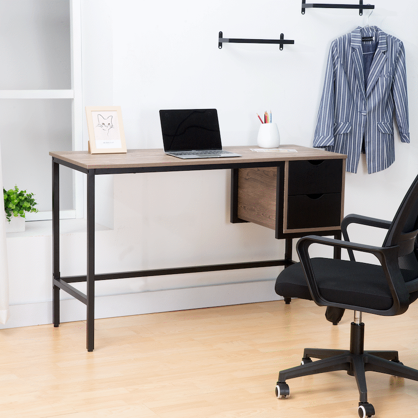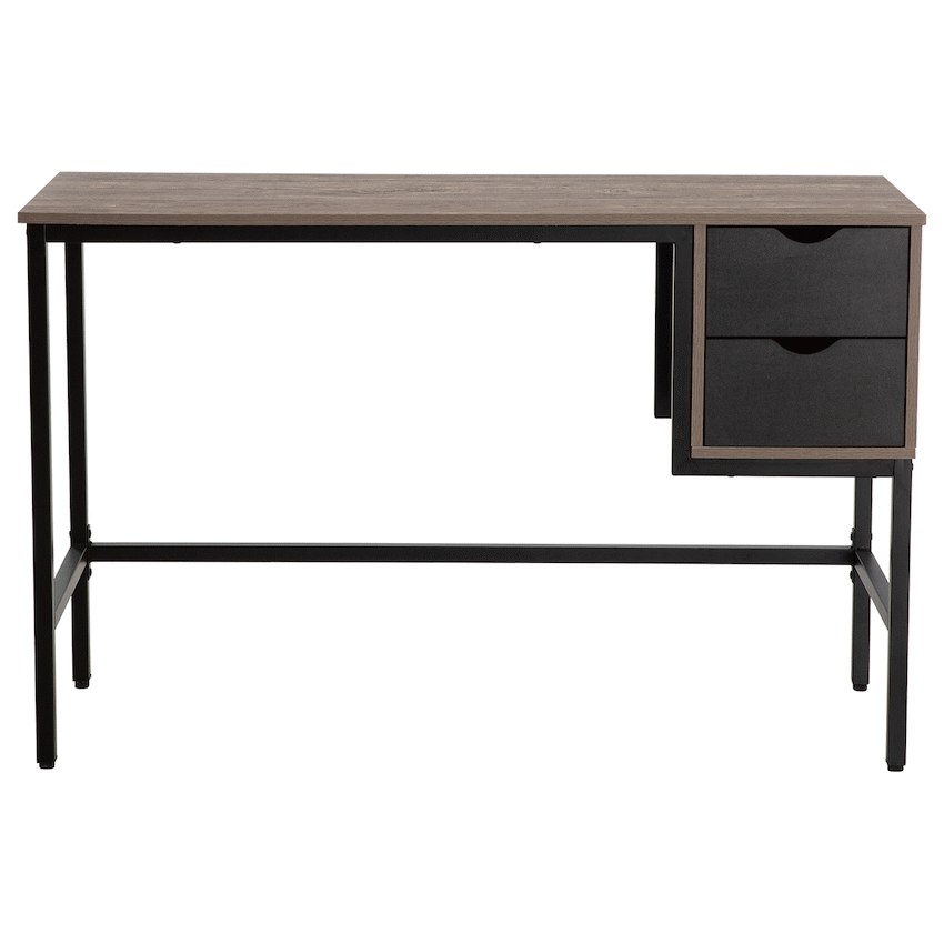 - Two integrated drawers provide storage for office items.