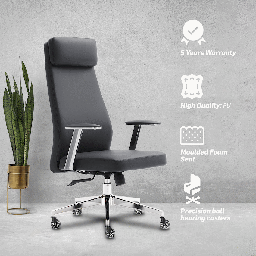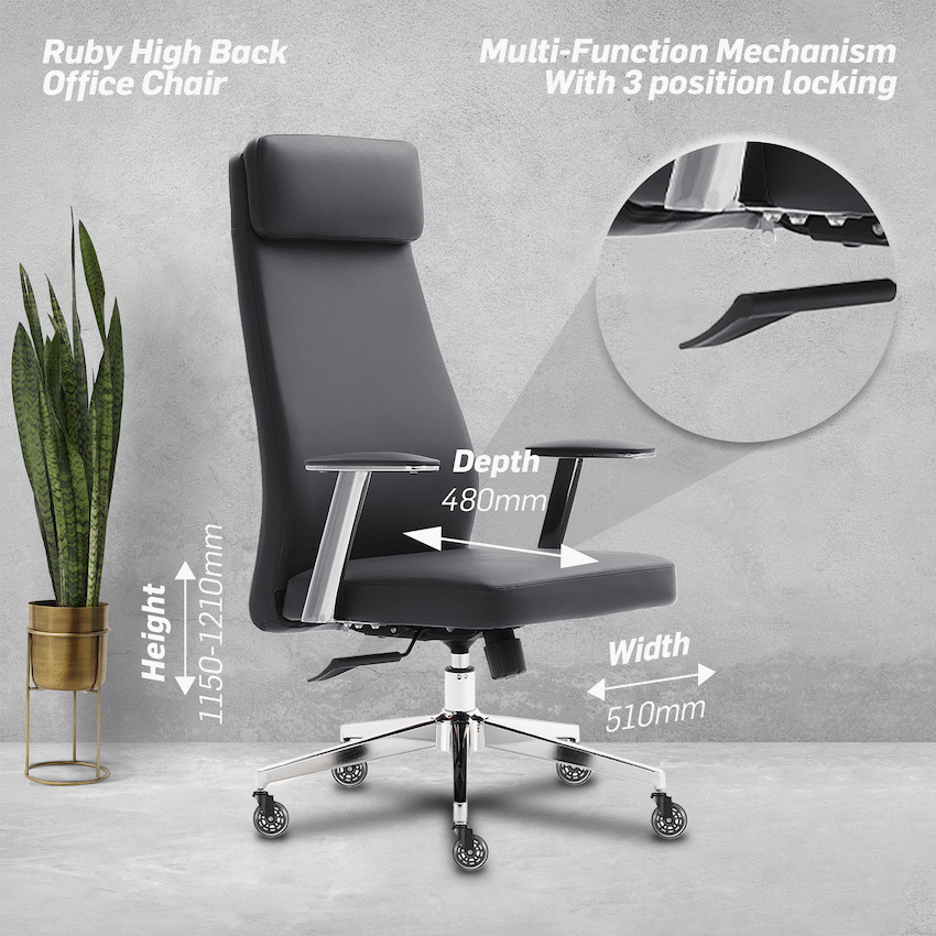 The Everfurn Ruby High Back Office Chair provides comfort and support for long work periods. Its high back design aids posture, and a sturdy chrome metal base ensures stability. This Everfurn chair is a dependable option for any office environment.