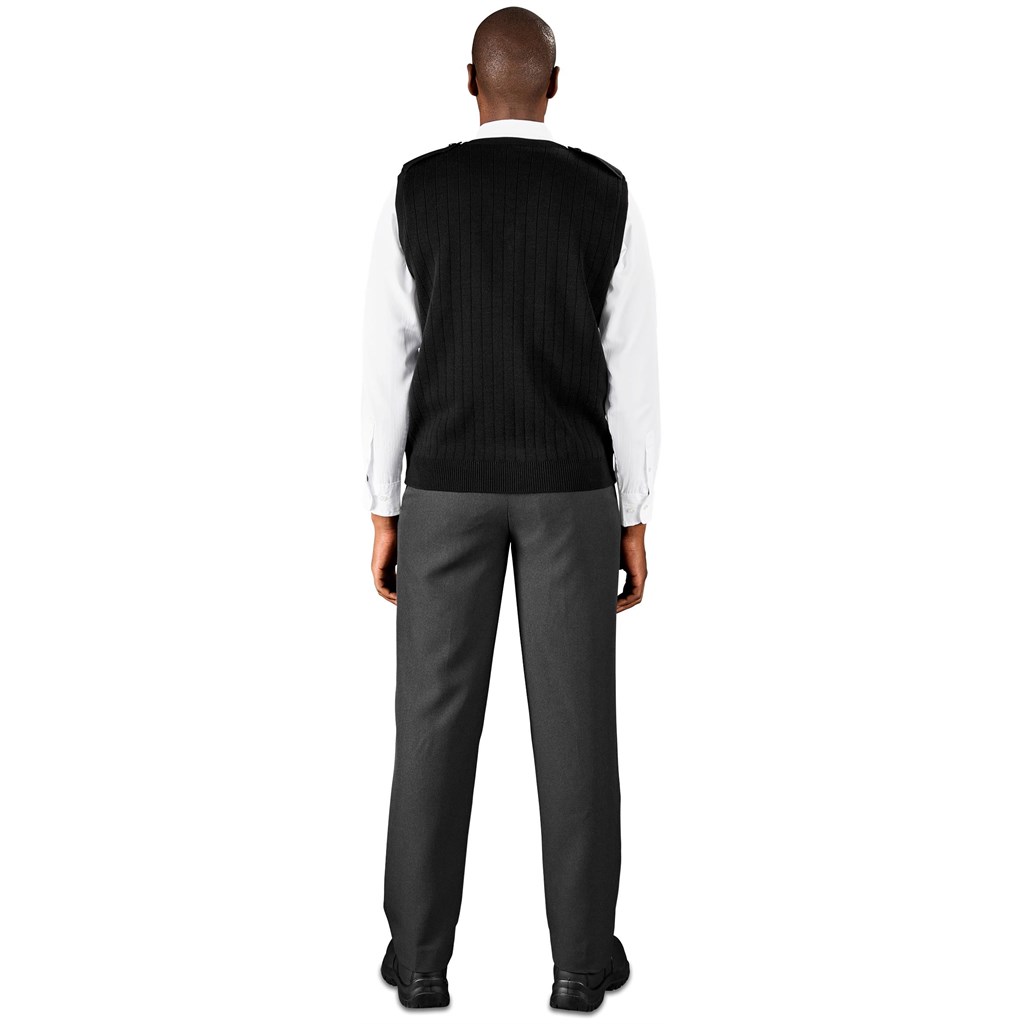- Features a classic V-neck and a rib knit design for a smart look.