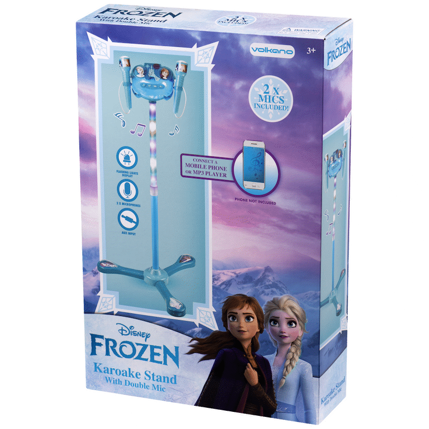 This Frozen double mic karaoke stand provides fun for two children singing together. It includes two microphones and features popular Disney Frozen characters. This stand is ideal for family promotions and events.