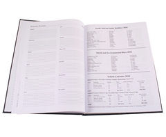 • Inner pages contain valuable South African information such as Public Holidays, Social and Environmental Days, Holy Days & Religious Festivals, School Calendar, SA National Symbols, and the Gautrain Timetable.