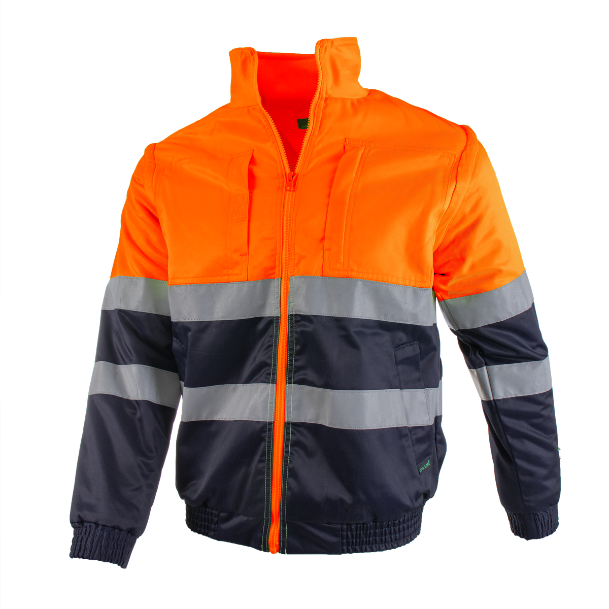 This two-tone bomber jacket provides good visibility and comfort for your team. It has 50mm silver reflective tape and a warm fleece lining. Zip-off sleeves make it adaptable. It works well for promoting your brand.