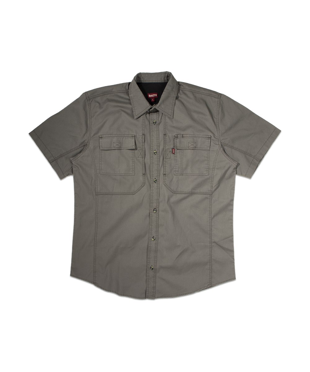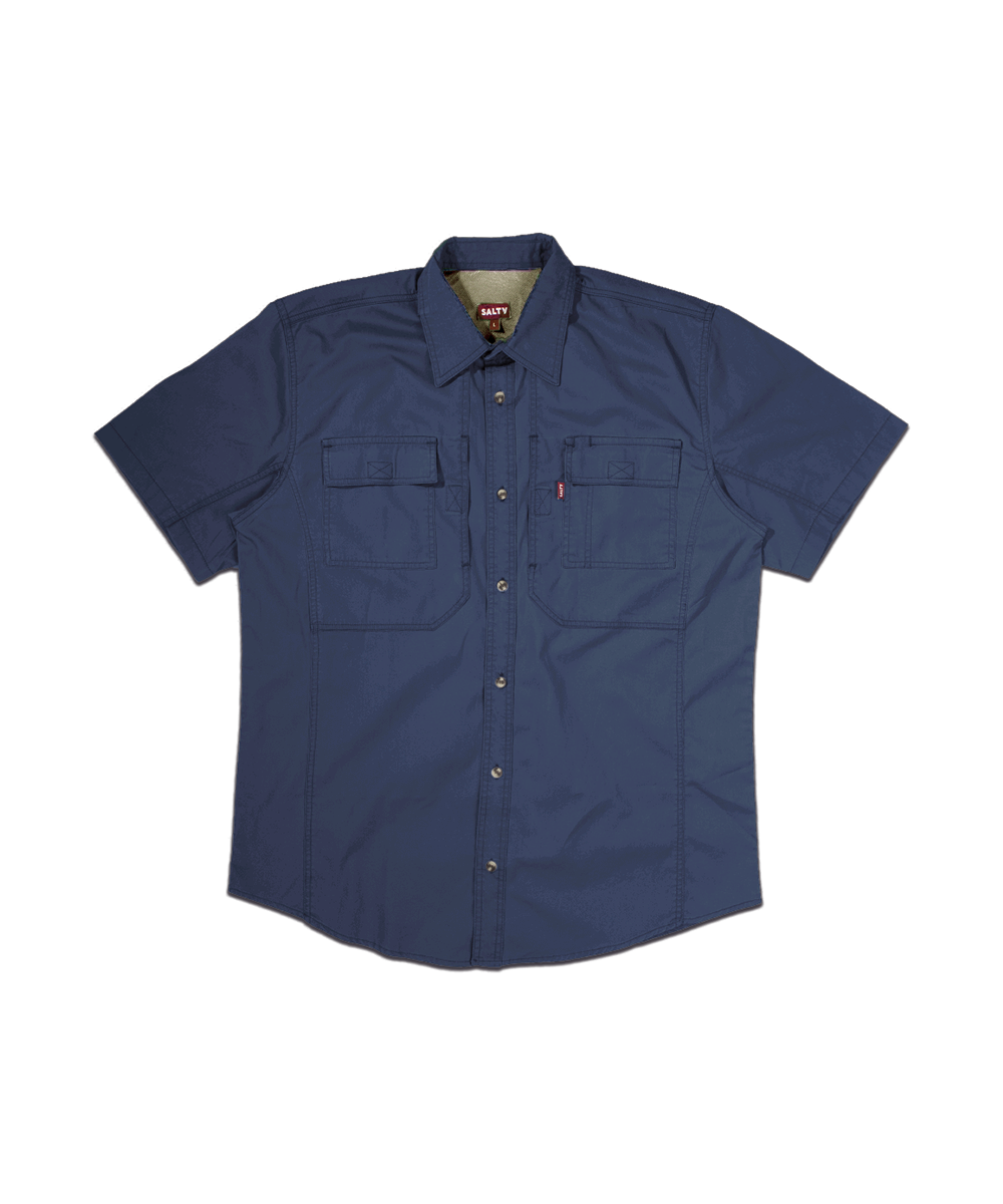 - Details include mock horn buttons, a rounded shirt hem, and double needle topstitching throughout.