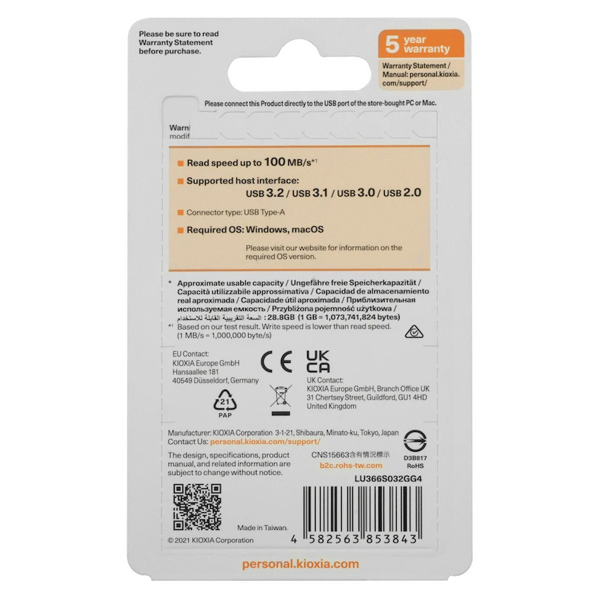 The Kioxia U366 32GB USB 3.2 metal drive offers reliable storage for your files. It provides fast data transfers and has a durable metal casing for daily use. This Kioxia product is a practical storage solution.