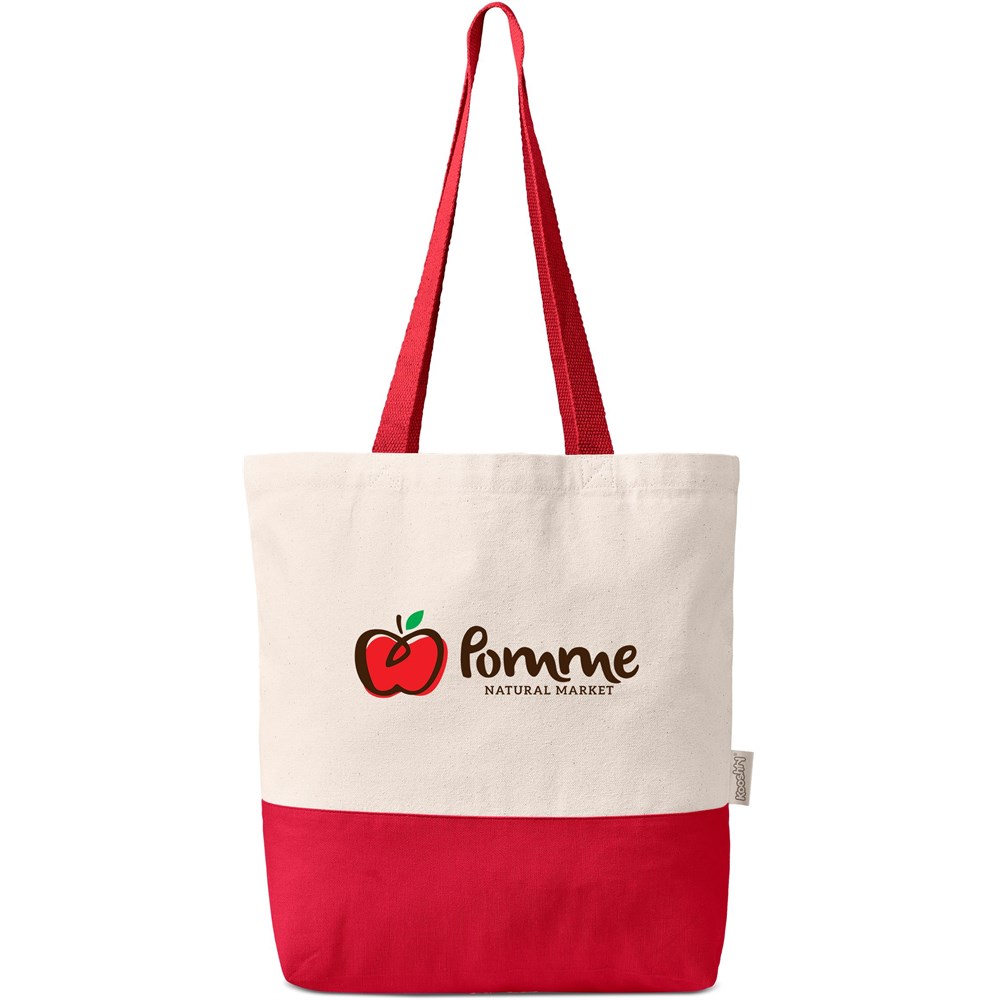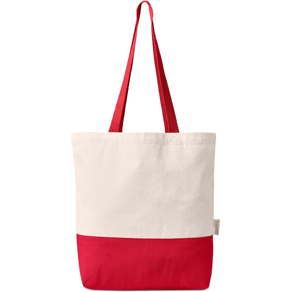 - Features long, coloured cotton webbing handles and a coloured bottom panel.