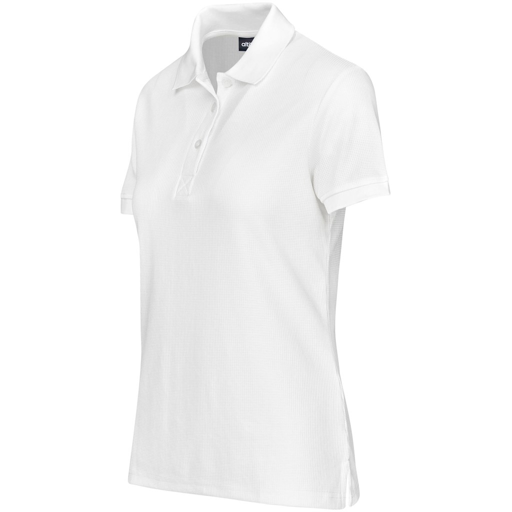 This Ladies Exhibit Golf Shirt offers a comfortable, smart appearance for promotional use. Made from 190g/m² 100% polyester waffle knit fabric, it features a knitted collar and cuffs. The easy-care fabric is durable and crease resistant, making it ideal for branding.