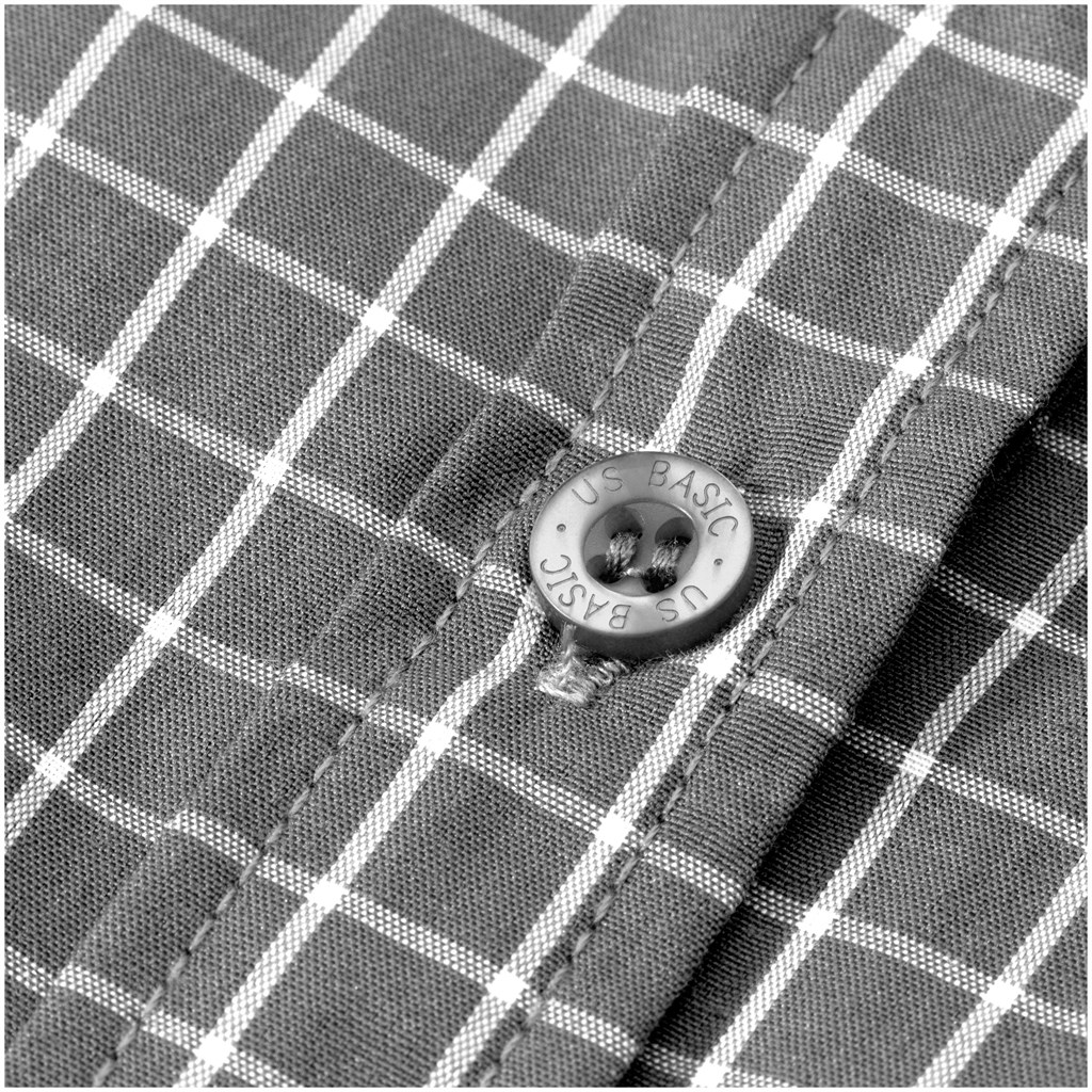 - Features include two button cuffs, tone-on-tone logo buttons, a left chest pocket, and a curved hemline, all with a bold check pattern.