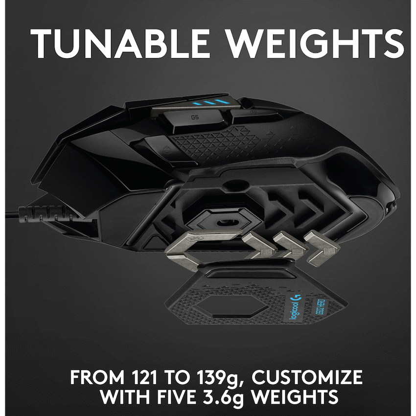 Experience accurate gaming control with the Logitech G502 HERO mouse. It uses an advanced optical sensor for precise tracking and offers adjustable sensitivity up to 25,600 DPI. Five repositionable weights allow for balance adjustments, making it a truly personal Logitech G gaming tool.