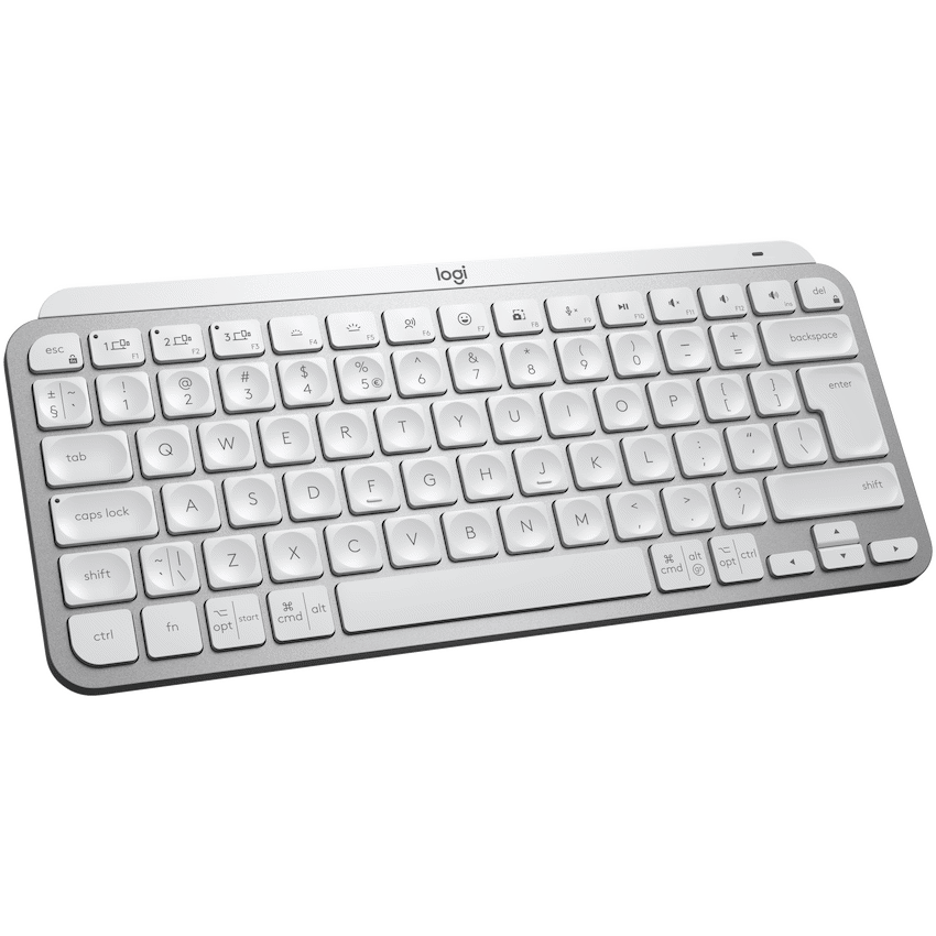 This Logitech MX Keys Mini in pale grey provides a compact and efficient typing experience. It features Perfect Stroke keys and smart illumination that automatically adjusts. Connect up to three devices via Bluetooth, making it ideal for professionals.