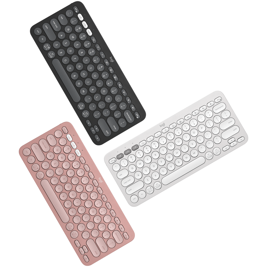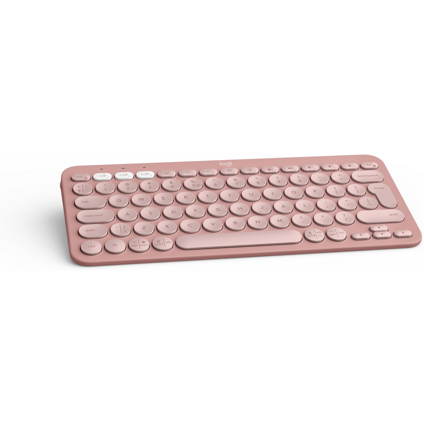Enjoy quiet, comfortable typing with the Logitech Pebble Keys 2 K380s wireless keyboard. It connects to three devices using Bluetooth for easy switching. This compact Tonal Rose keyboard is a practical addition to any workspace.