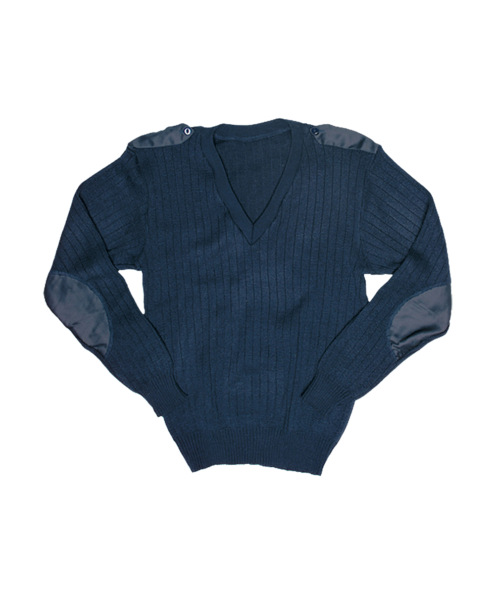 - Features a V-neck design, epaulettes attached with matching 2 eye 15mm buttons, and elbow patches.