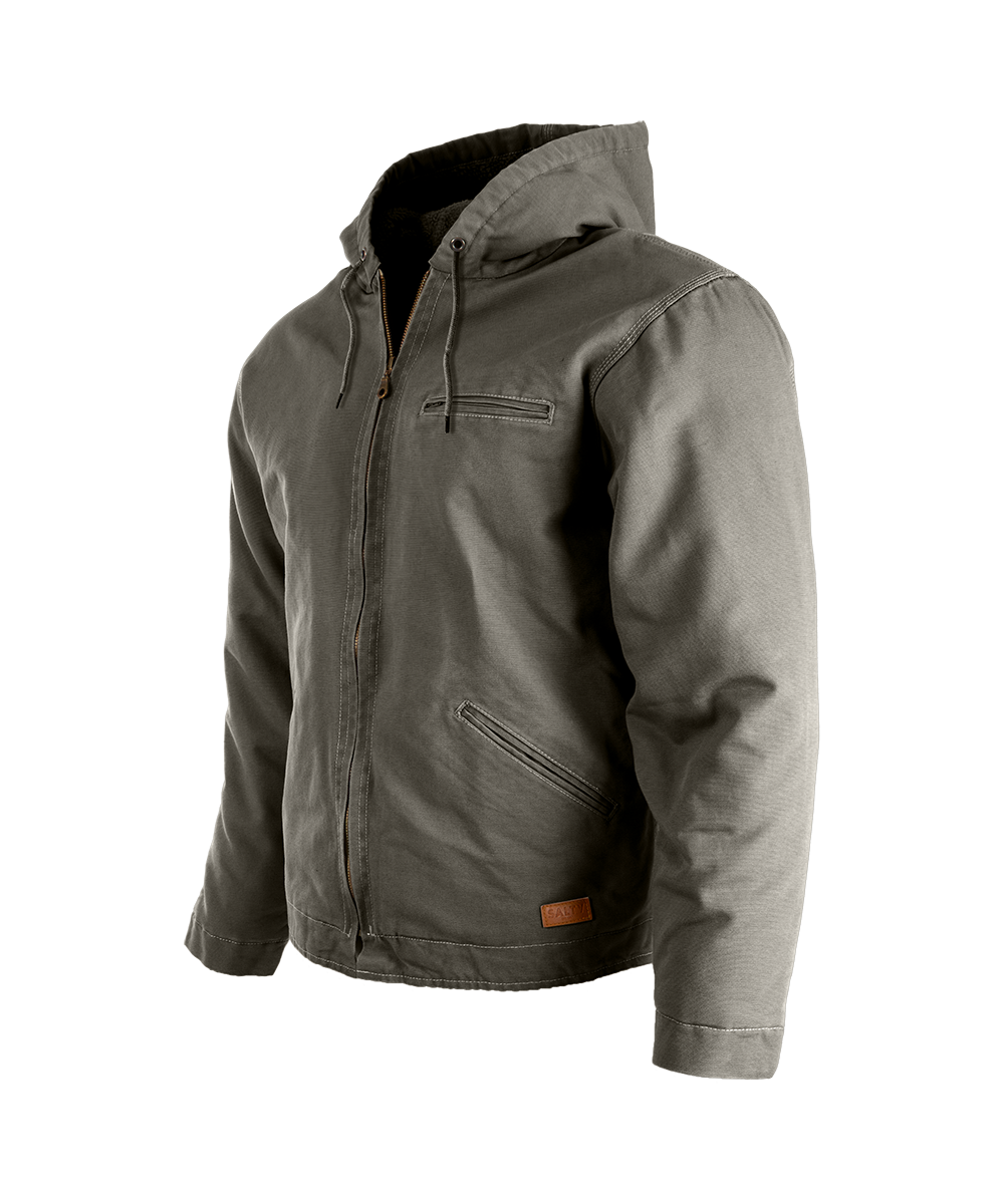 - A Sherpa-lined three-piece hood with an adjustable draw cord and triple stitched side and shoulder seams add to its practical design.