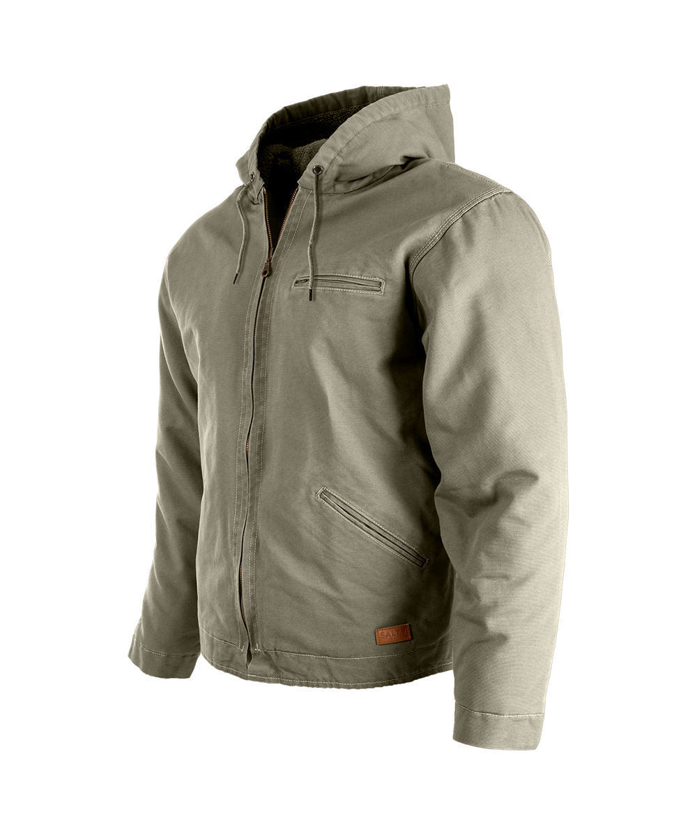 - This jacket is made from 100% Cotton canvas duck outer (360g/m²) with a Polyester Sherpa lining in the body and hood (270g/m²), plus thermal batting (210g/m²) in the sleeves.