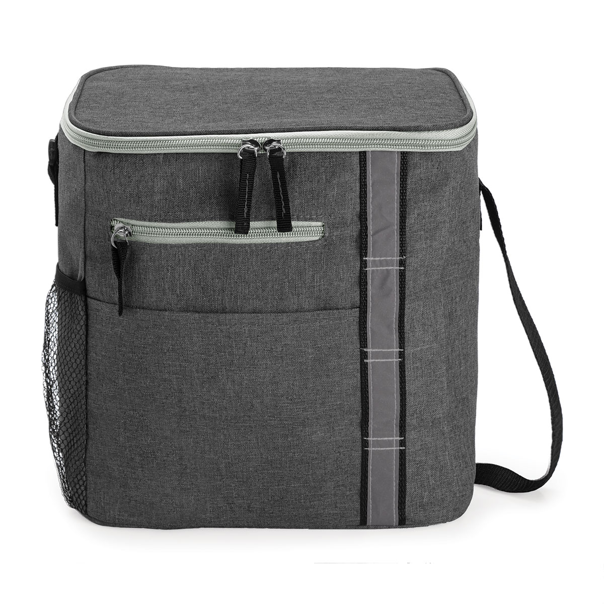 - Main zippered compartment holds up to 12 standard-sized cans, with an insulated grey PEVA lining for temperature retention.