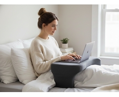 This memory foam U-shape lap desk provides a comfortable, stable surface for laptops and books. Made from memory cotton with breathable netting, it includes two large side pockets for storage. It is a practical item for everyday convenience.