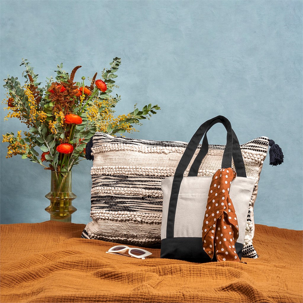 • Includes contrast bottom panel details and cotton shoulder straps.