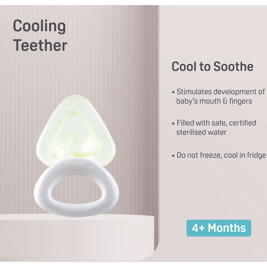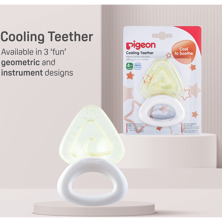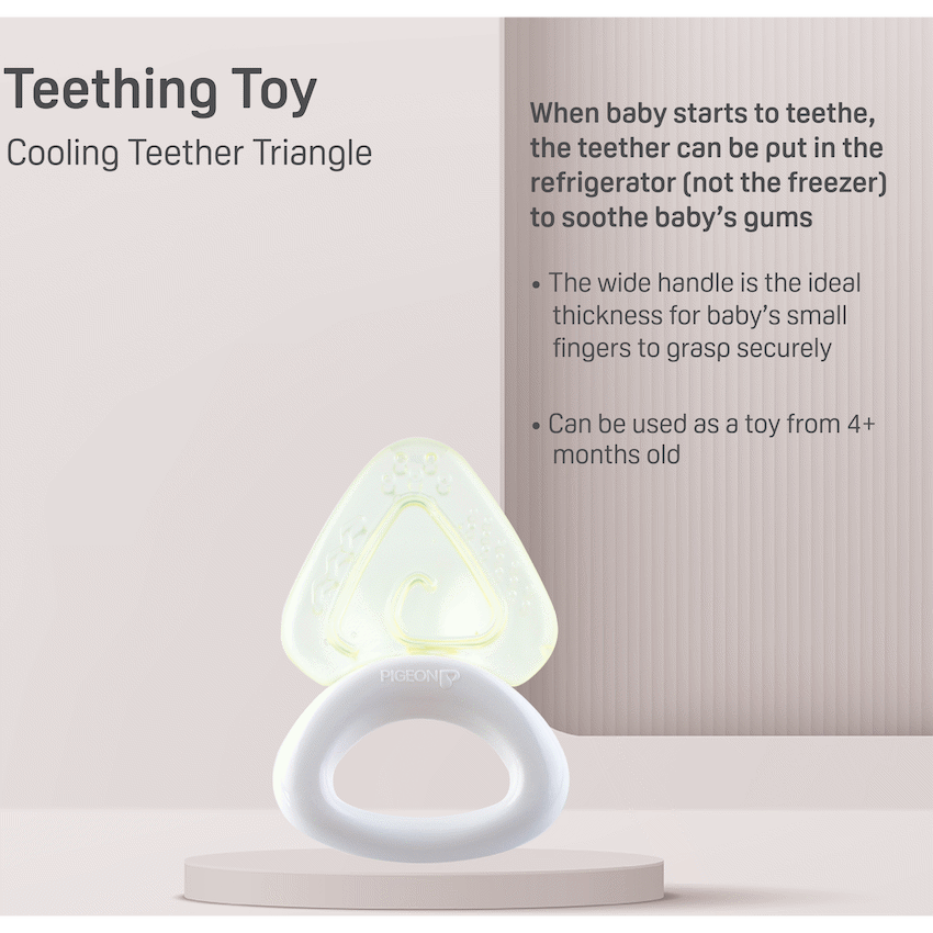 The Pigeon Cooling Teether Triangle calms sore gums. It contains sterilised water that cools when refrigerated, offering comfort for babies aged 4 months and up. This BPA-Free teether also aids mouth and finger development, a reliable item from Pigeon.