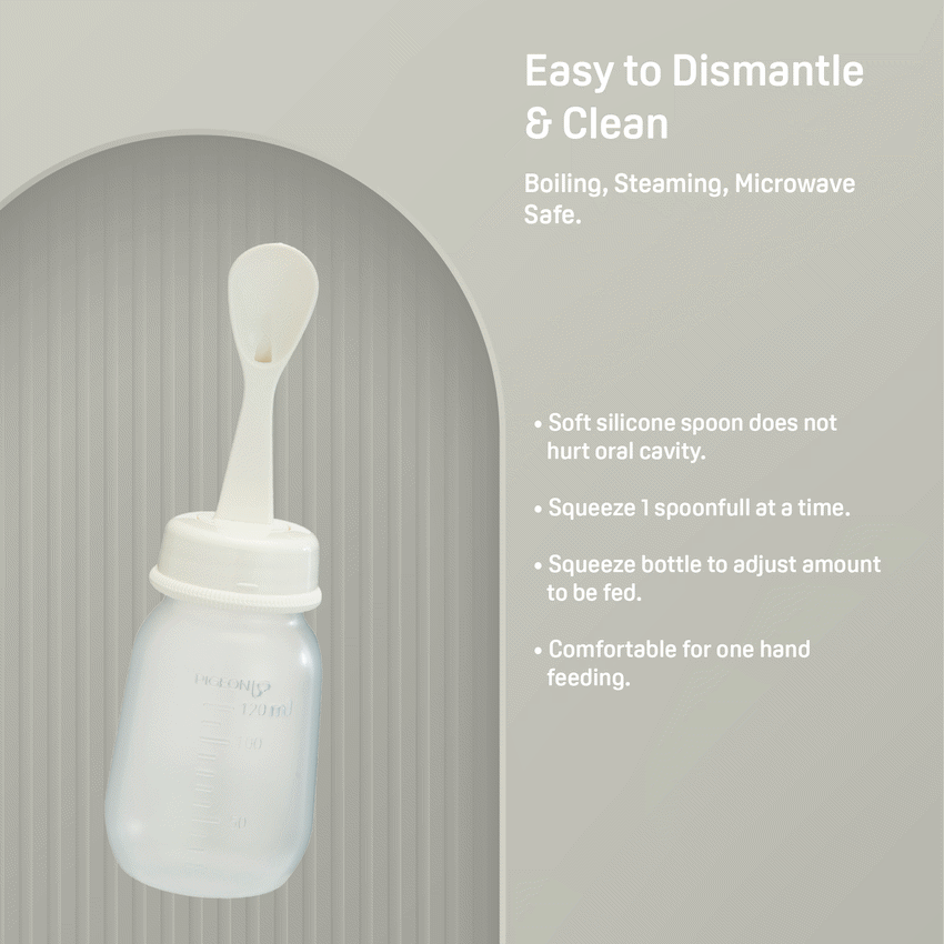 Offer a practical general promotional item for new parents with the Pigeon Weaning Bottle + Spoon.