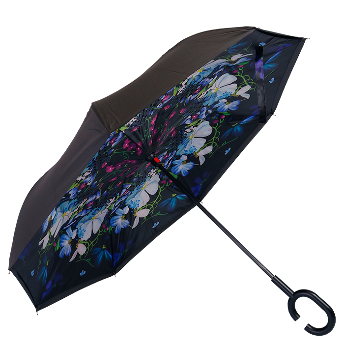 - This umbrella features a clever reversible design, allowing it to close without drips and keeping the wet surface contained.
